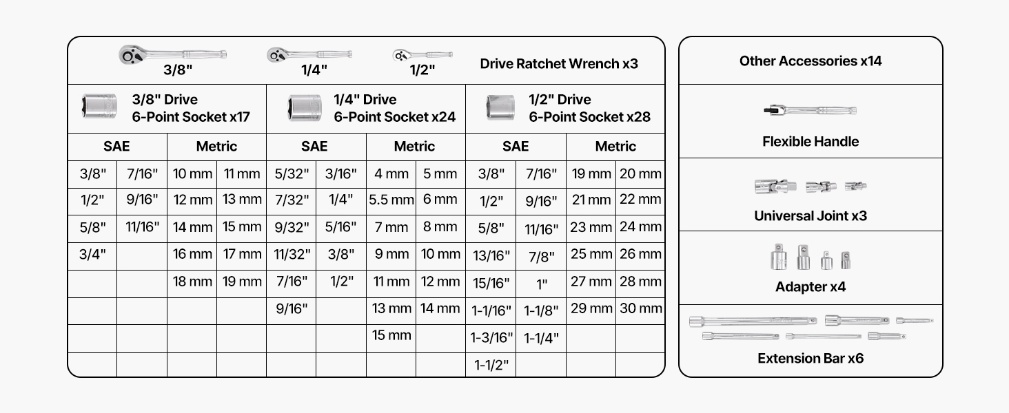Táto sada nástrčiek 3/8, 1/4 a 1/2 palca je vyrobená z vysokokvalitných materiálov odolných voči korózii a poskytuje vynikajúci rázový výkon. Konštrukcia s vysokým krútiacim momentom zaisťuje dostatočnú silu na riešenie zadretých alebo skorodovaných matíc, čím urýchľuje a uľahčuje opravy a demontáž.