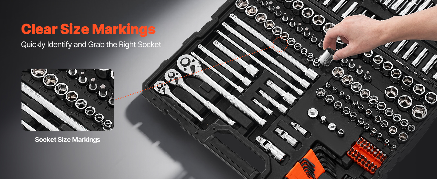 Každá nástrčka má vygravírované, ľahko čitateľné označenie veľkosti, ktoré je vysoko odolné proti opotrebovaniu. Táto súprava nástrčných hlavíc zaručuje rýchlu identifikáciu a rýchlejší prístup k správnemu nástroju, keď ho potrebujete.