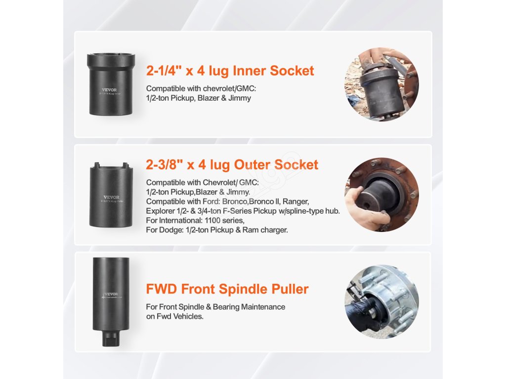 Táto sada nástrčných hlavíc na matice vretena obsahuje 6 rôznych veľkostí - 2-3/4" x 4 Lug Outer, 2-5/8" x 6 Lug Outer, 2-3/8" x 4 Lug Outer, 2-1/2" x 4 Lug Inner, 2-1/4" x 4 Lug Inner a sťahovák prednej nápravy FWD. Ideálne na údržbu širokej škály vozidiel.