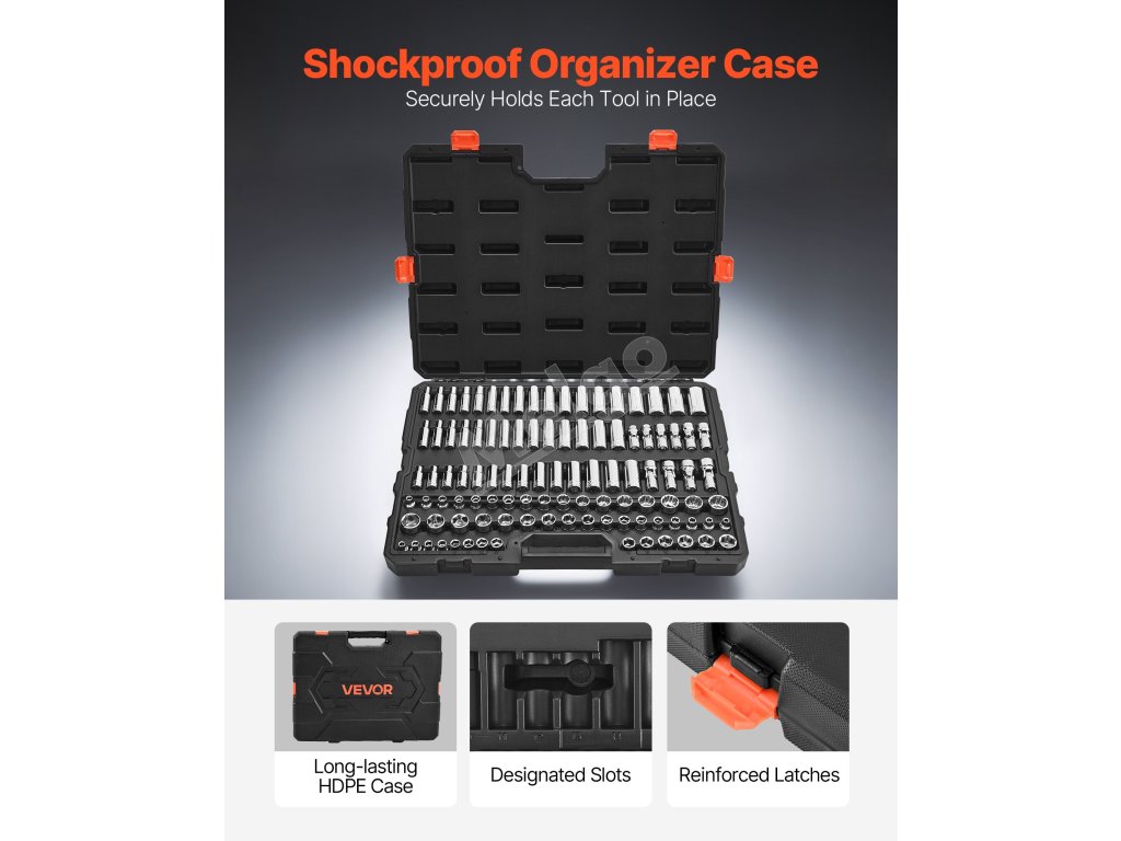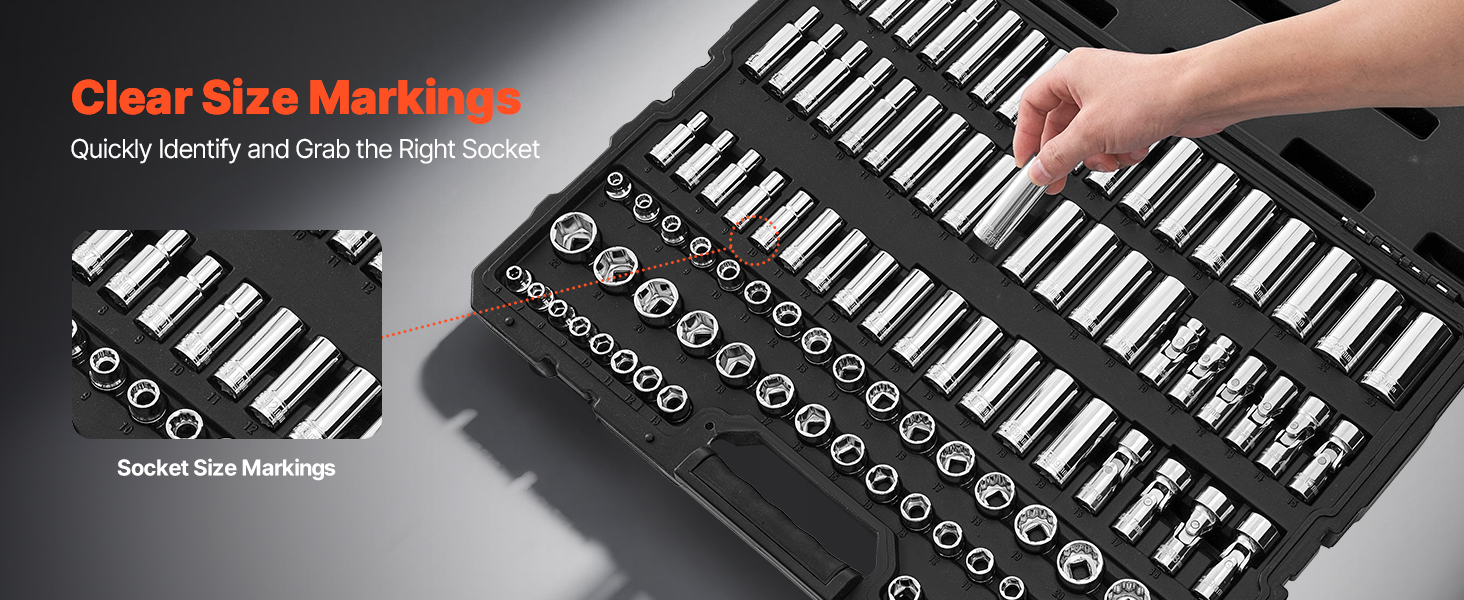 Každá nástrčka má vyryté, ľahko čitateľné označenie veľkosti, ktoré je vysoko odolné proti opotrebovaniu. Táto sada nástrčných hlavíc zaručuje rýchlu identifikáciu a rýchlejší prístup k správnemu nástroju, keď ho potrebujete.