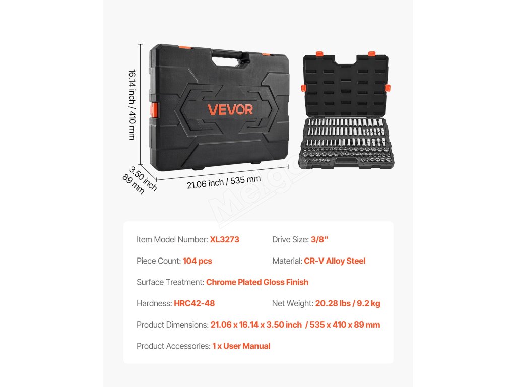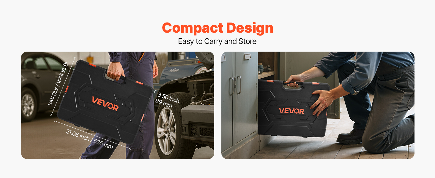 Kufrík s metrickou sadou nástrčných hlavíc, navrhnutý na prenášanie, má rozmery 21,06 x 16,14 x 3,50 palca / 535 x 410 x 89 mm. Jeho kompaktné rozmery sa ľahko zmestia do stiesnených priestorov alebo sa dajú prenášať na cestách, čo zaručuje efektívnu prácu kdekoľvek.