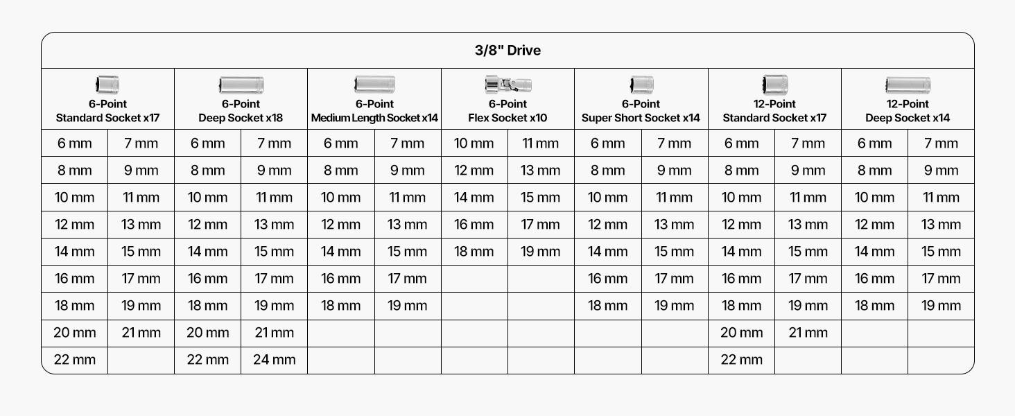 Táto sada nástrčiek 3/8 palca je vyrobená z vysokokvalitných materiálov odolných voči korózii a poskytuje vynikajúci rázový výkon. Konštrukcia s vysokým krútiacim momentom zaisťuje dostatočnú silu na riešenie zadretých alebo skorodovaných matíc, čo urýchľuje a uľahčuje opravy a demontáž.