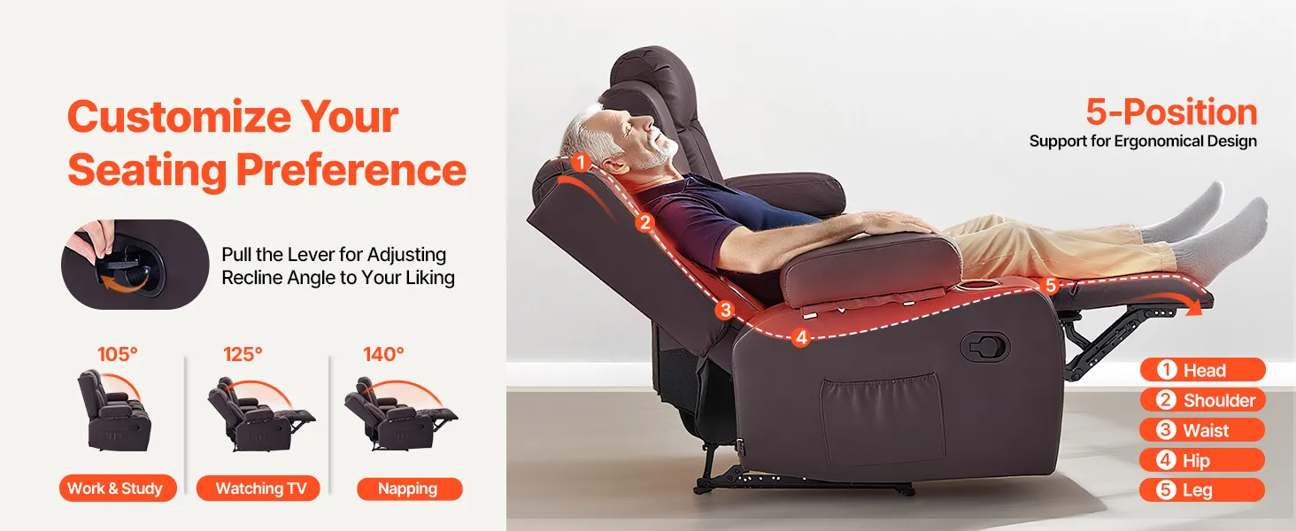 Oddýchnite si naplno s týmto manuálnym polohovateľným kreslom! Kedykoľvek si nastavte preferovanú polohu na ležanie, ktorá vám a vašej rodine ponúka individuálne pohodlie, aby ste si mohli vychutnať voľný čas.