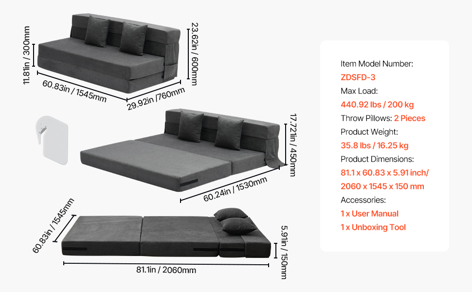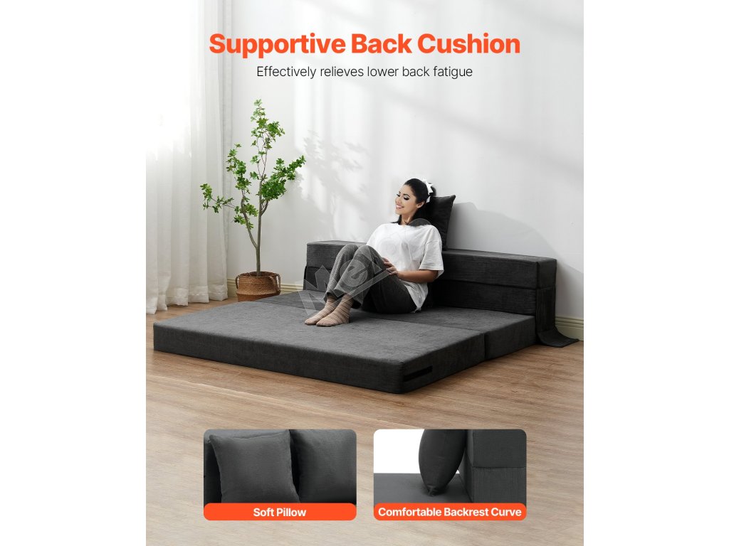 Rozkladacia sedačka 3v1 s 25D penou, prateľný poťah, queen tmavá
