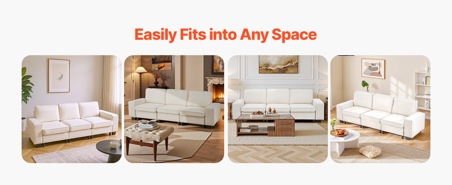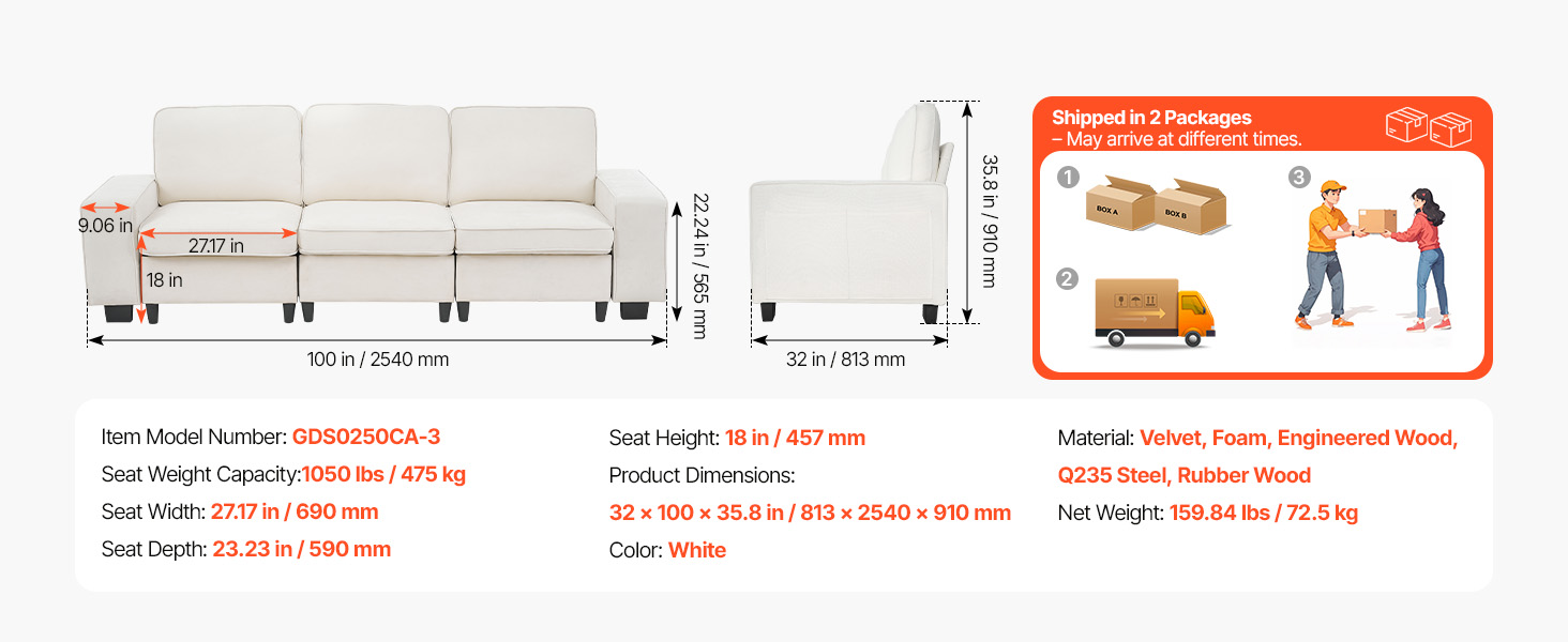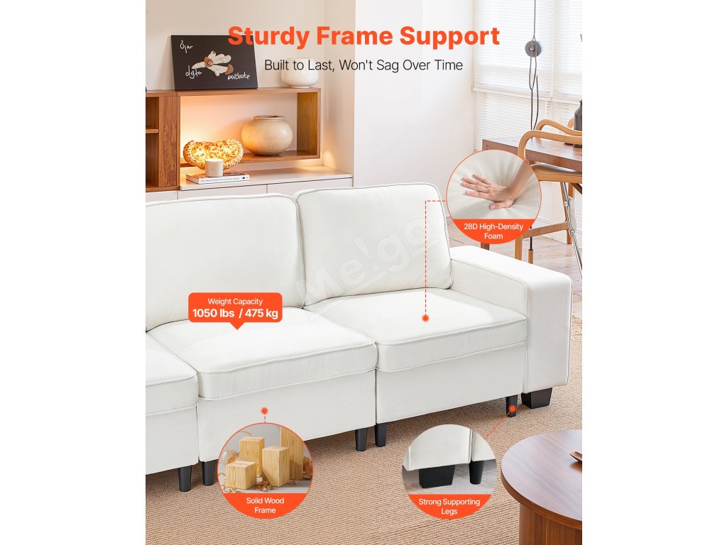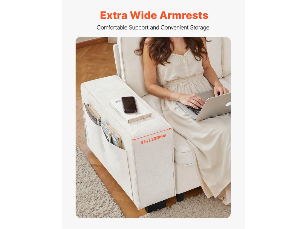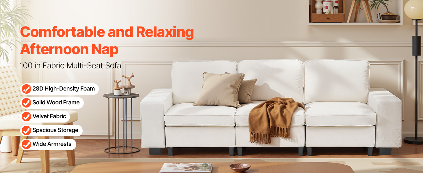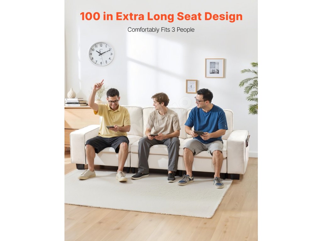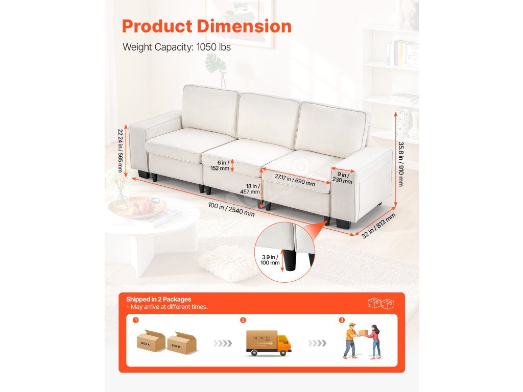 Táto trojmiestna pohovka s dĺžkou 100 palcov / 2540 mm kombinuje rám z masívneho dreva s 28D penou s vysokou hustotou pre výnimočnú odolnosť a oporu. Súčasťou pohovky je aj priestranný úložný priestor pod každým sedadlom, ktorý je ideálny na uloženie prikrývok, vankúšov, kníh, hračiek a ďalších vecí, vďaka čomu bude váš obývací priestor usporiadaný.