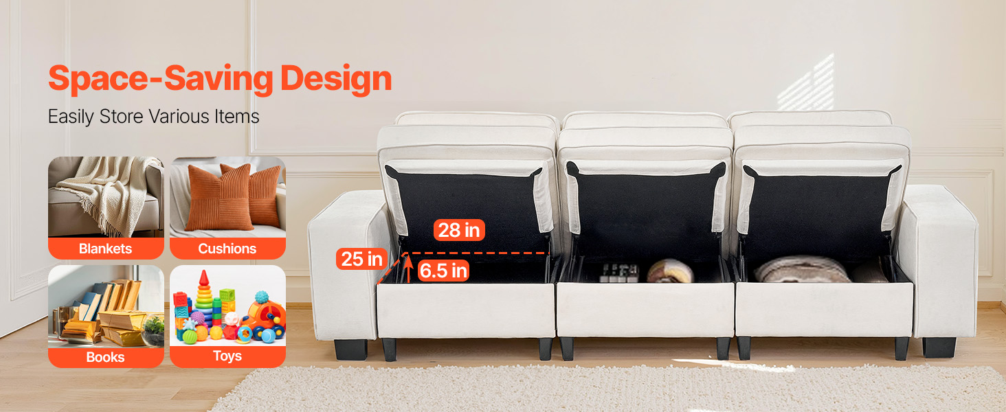 Každé sedadlo je vybavené veľkorysým úložným priestorom pod sedadlom s rozmermi 25 x 28 x 6,5 palca / 635 x 710 x 165 mm, ktorý poskytuje dostatok miesta na uloženie prikrývok, vankúšov, kníh, hračiek a ďalších vecí. Toto dômyselné riešenie úložného priestoru pomáha šetriť miesto a udržiava váš domov uprataný a organizovaný.