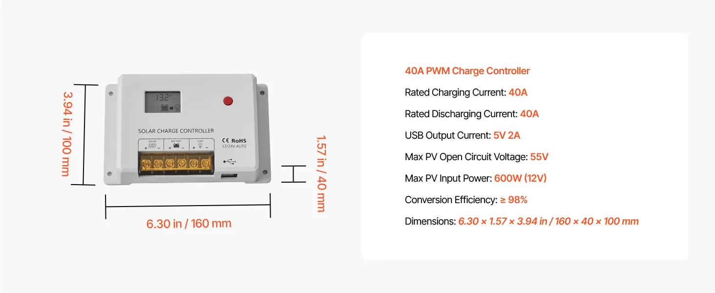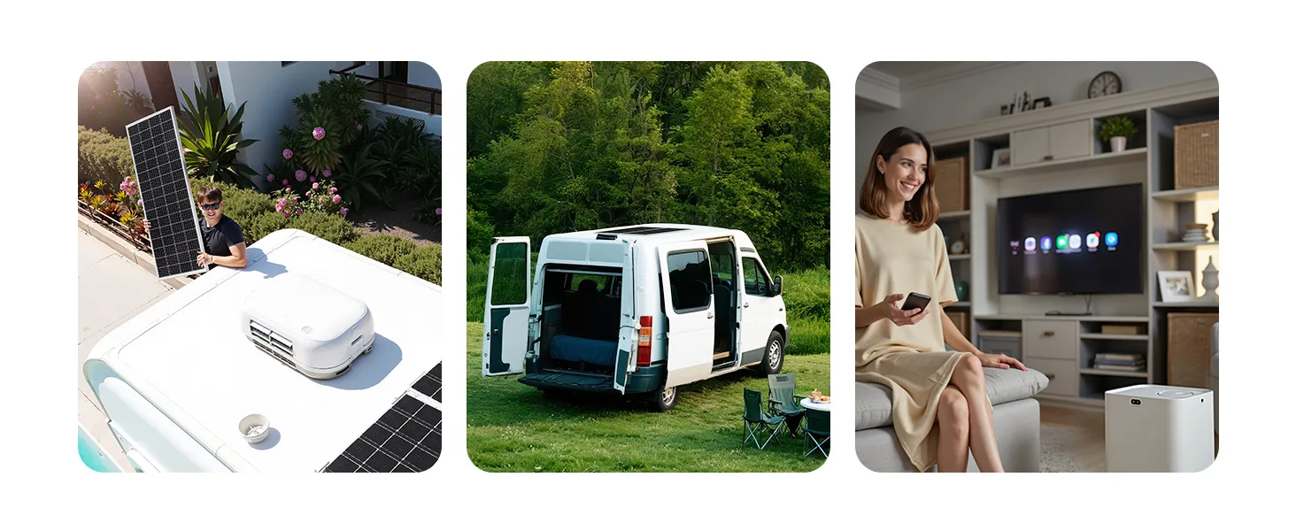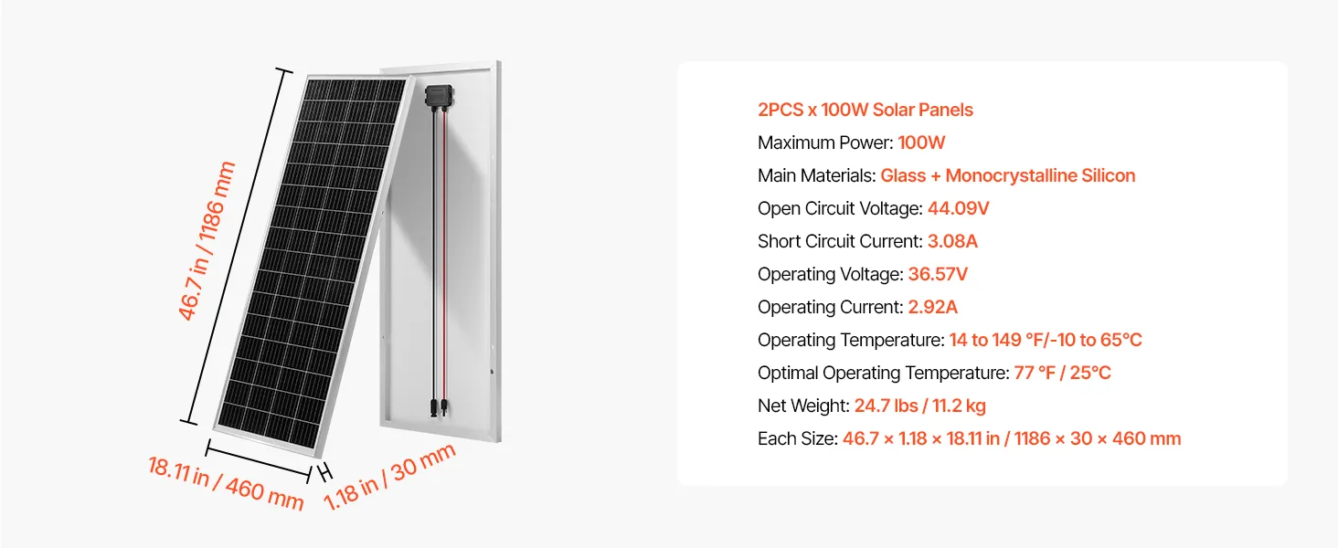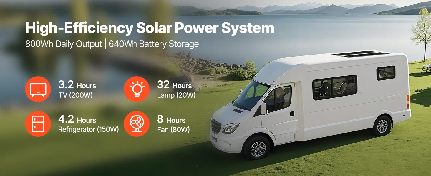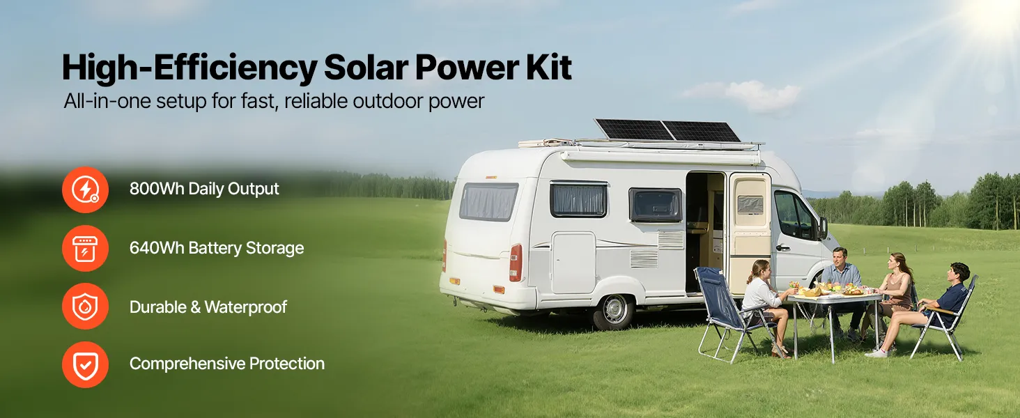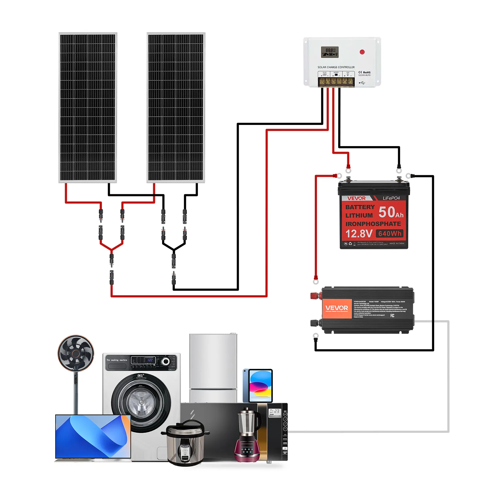 Táto kompletná súprava solárnej energie obsahuje 2 ks 100W monokryštalických solárnych panelov, 12,8V 50Ah LiFePO₄ batériu, 40A PWM regulátor solárneho nabíjania a 12V 800W striedač. S výkonom až 800Wh/deň a úložným priestorom 640Wh batérie poskytuje spoľahlivé napájanie pre obytné vozidlá, lode, domy, kempovanie a iné.