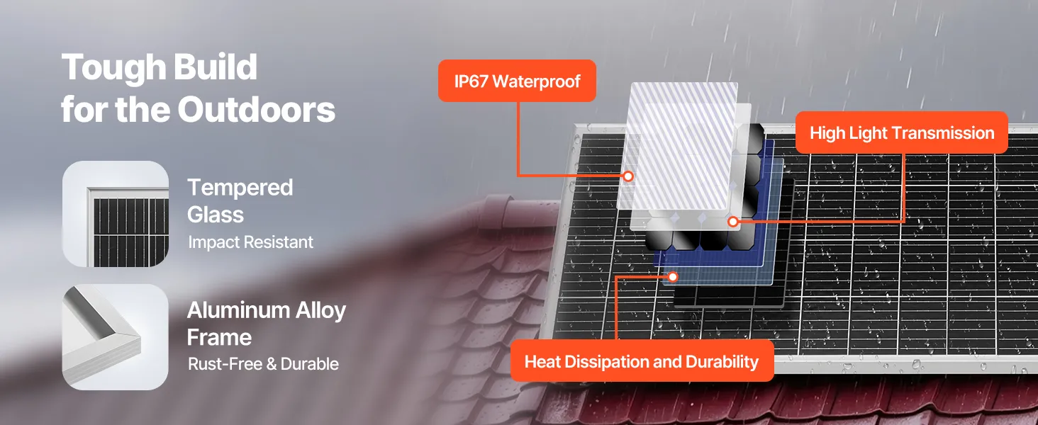 Monokryštalické solárne články s vysokou účinnosťou zabezpečujú vynikajúcu konverziu energie. Vďaka vodotesnosti IP67 sú spoľahlivé na dlhodobé používanie vo vonkajšom prostredí.