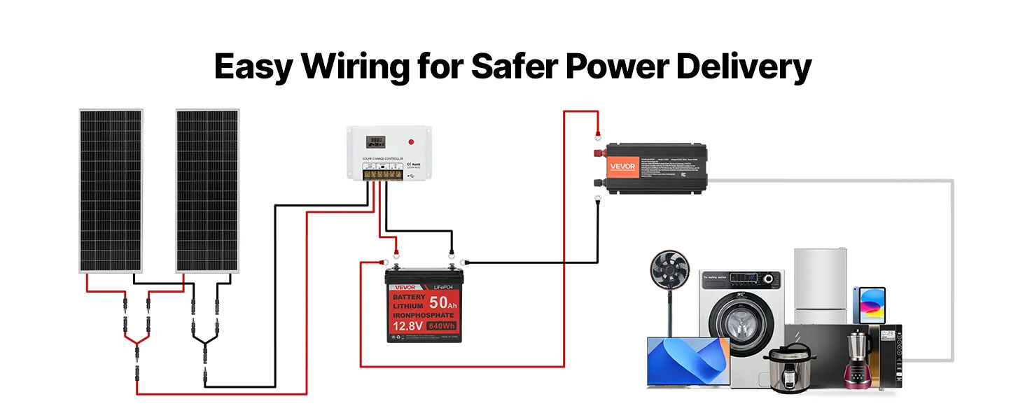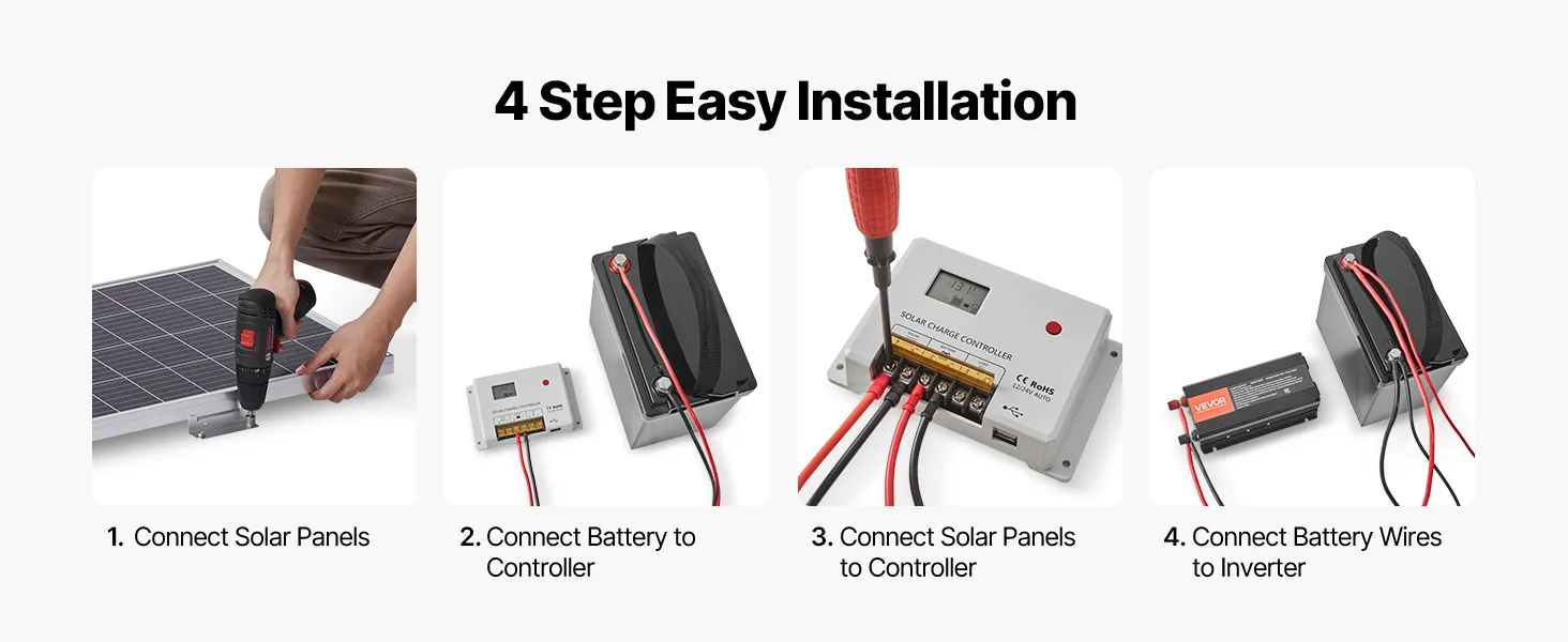 Obsahuje podrobné pokyny na zapojenie, ktoré vám umožnia rýchlo pripojiť batériu, solárne panely, regulátor a menič.