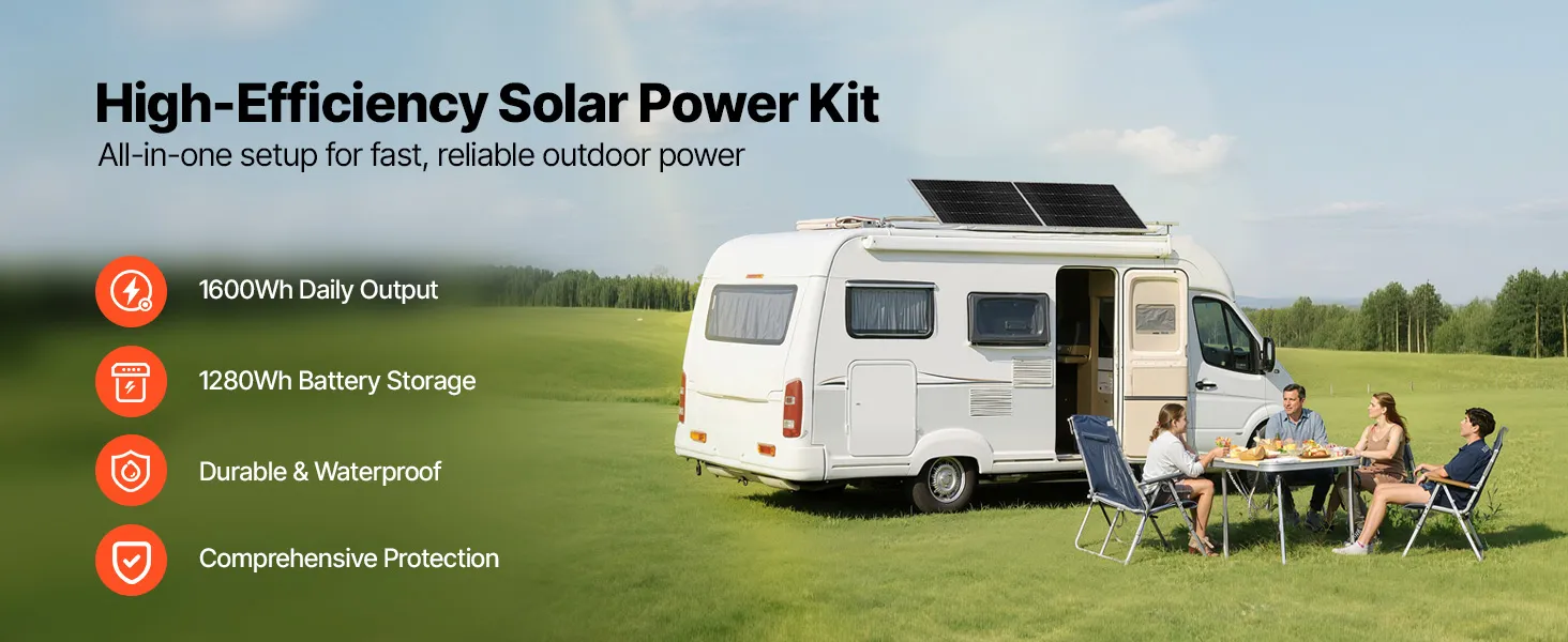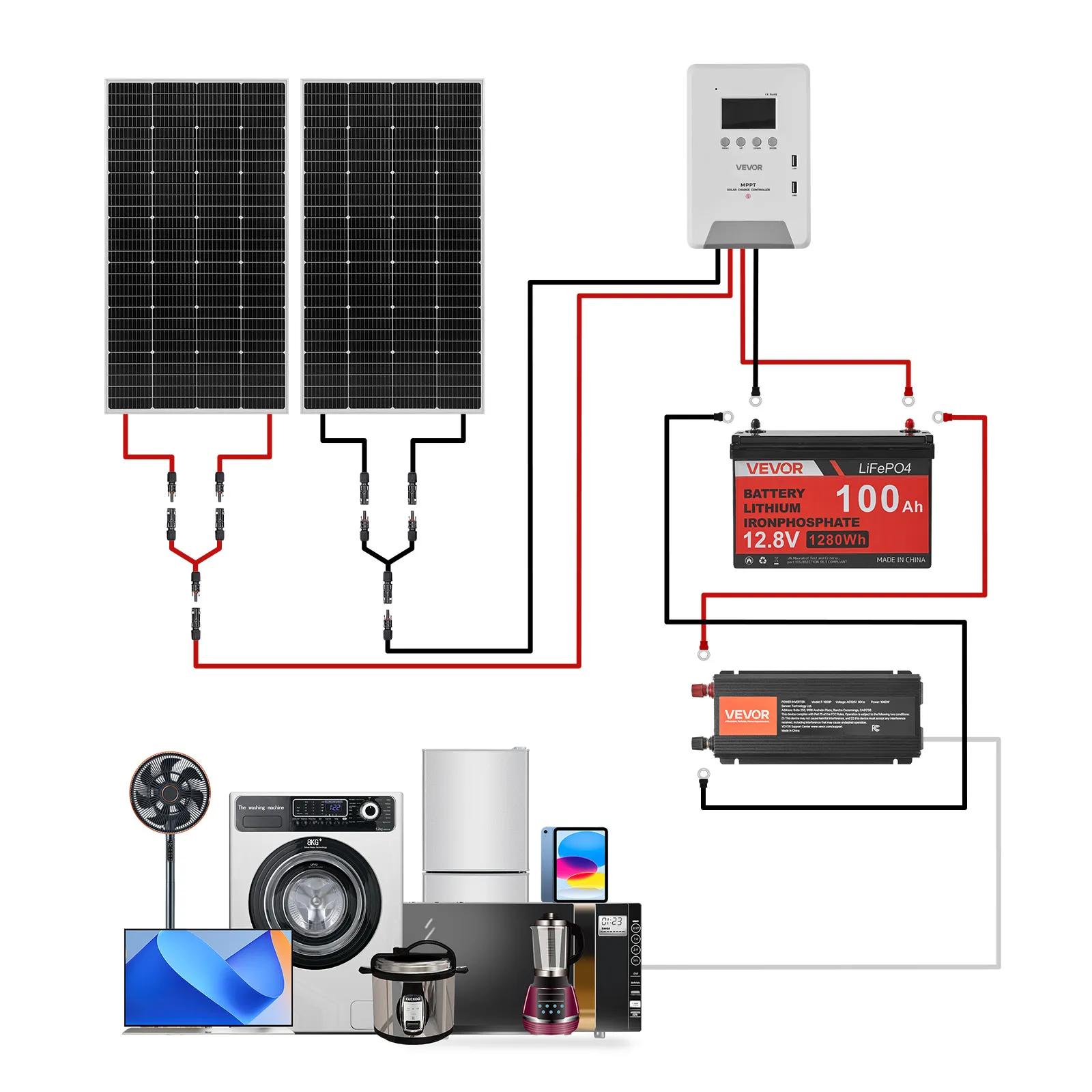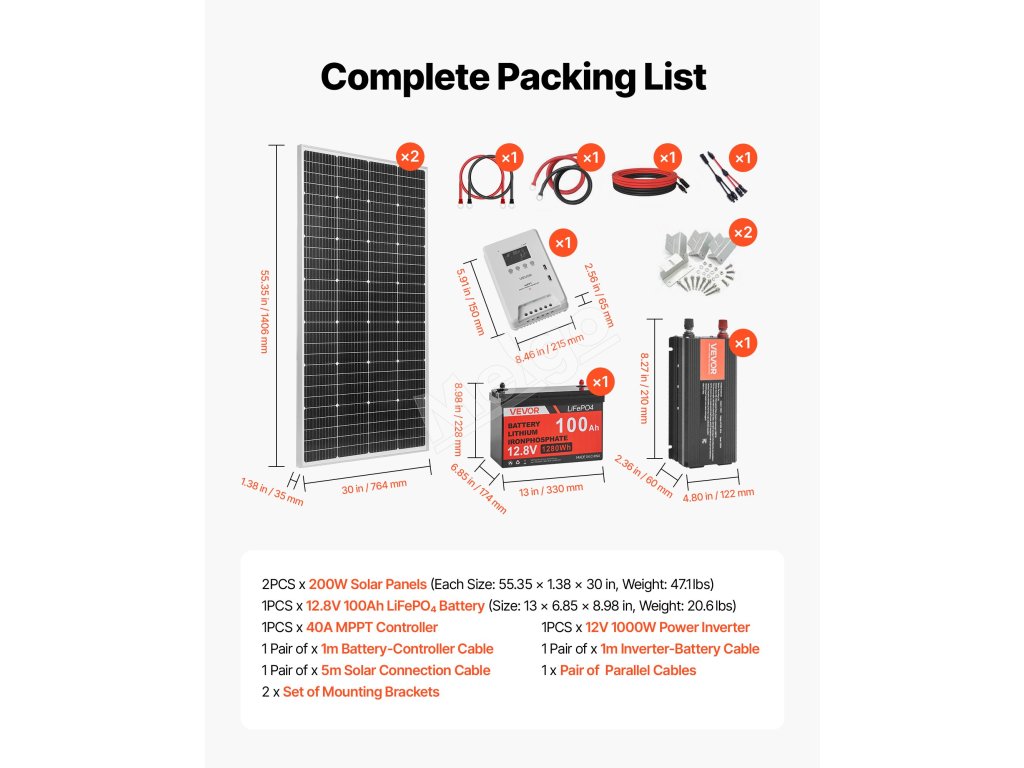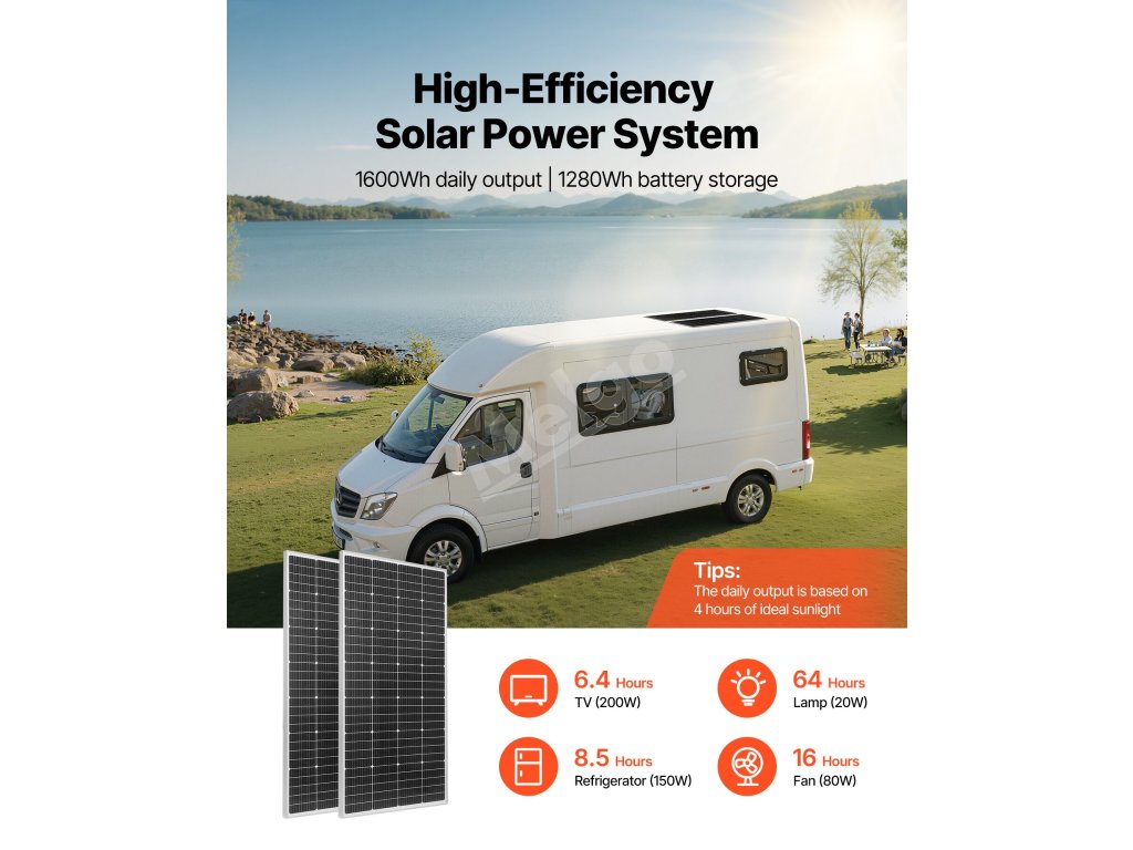 Táto súprava solárnej energie obsahuje 2 ks 200W monokryštalických solárnych panelov, 12,8V 100Ah LiFePO₄ batériu, 40A MPPT solárny regulátor nabíjania a 12V 1000W striedač. S výkonom až 1600Wh/deň a 1280Wh akumulátorom poskytuje spoľahlivé napájanie pre obytné vozidlá, lode, domy, kempovanie a iné.