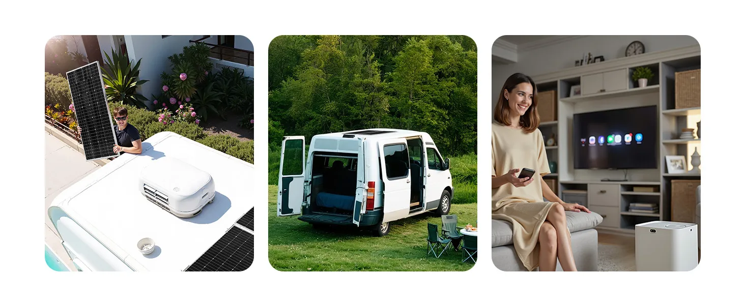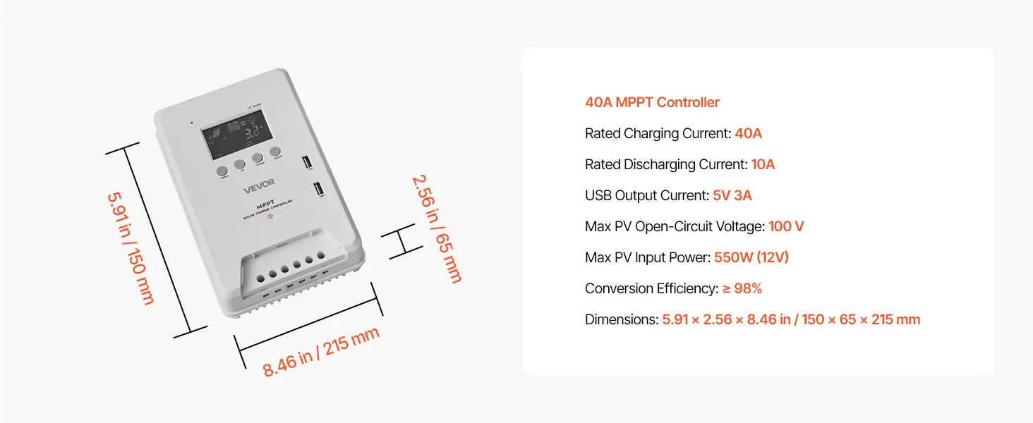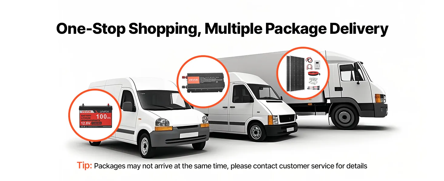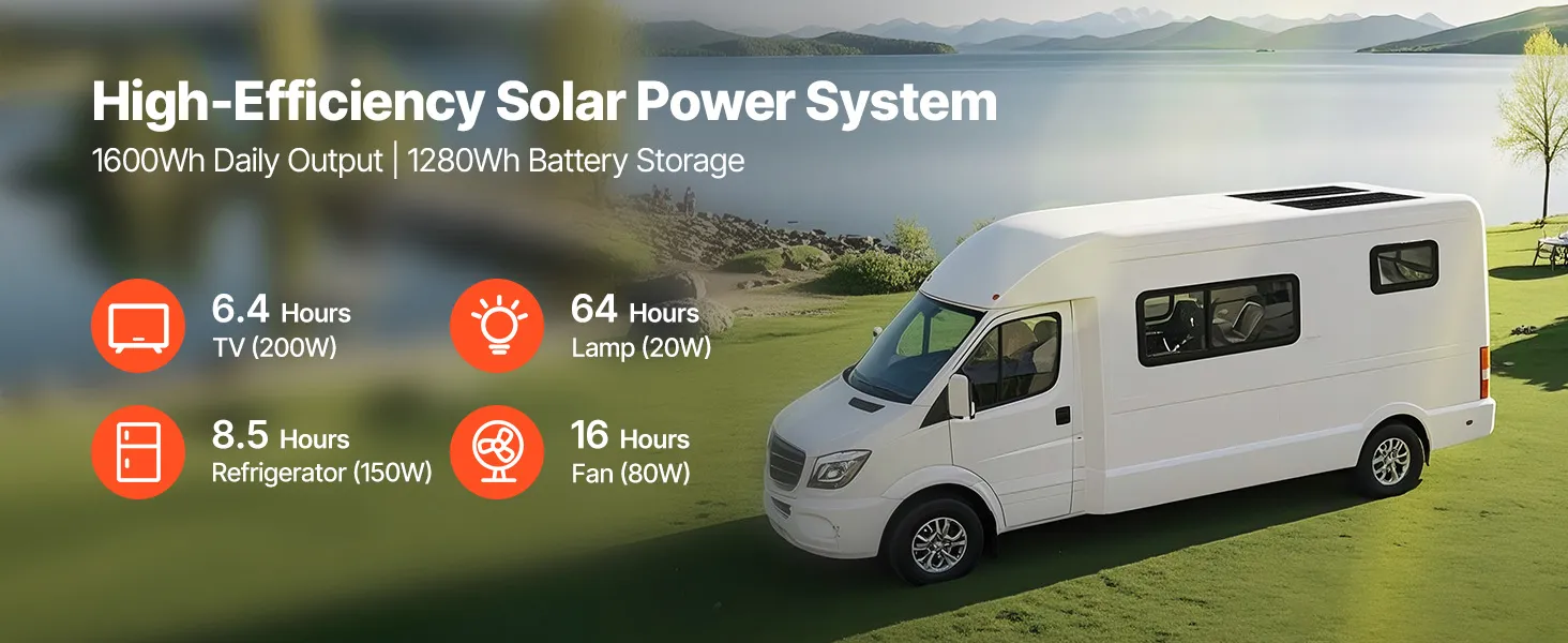 Táto súprava solárnej energie obsahuje 2 ks 200W monokryštalických solárnych panelov, 12,8V 100Ah LiFePO₄ batériu, 40A MPPT solárny regulátor nabíjania a 12V 1000W striedač. S výkonom až 1600Wh/deň a 1280Wh akumulátorom poskytuje spoľahlivé napájanie pre obytné vozidlá, lode, domy, kempovanie a iné.