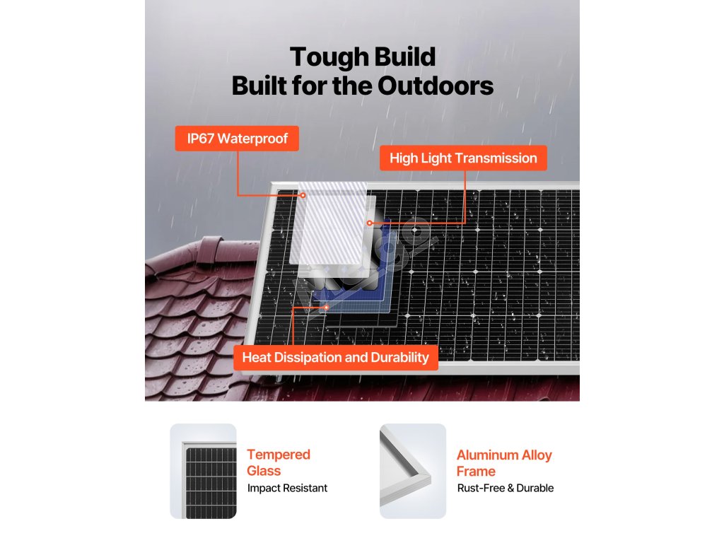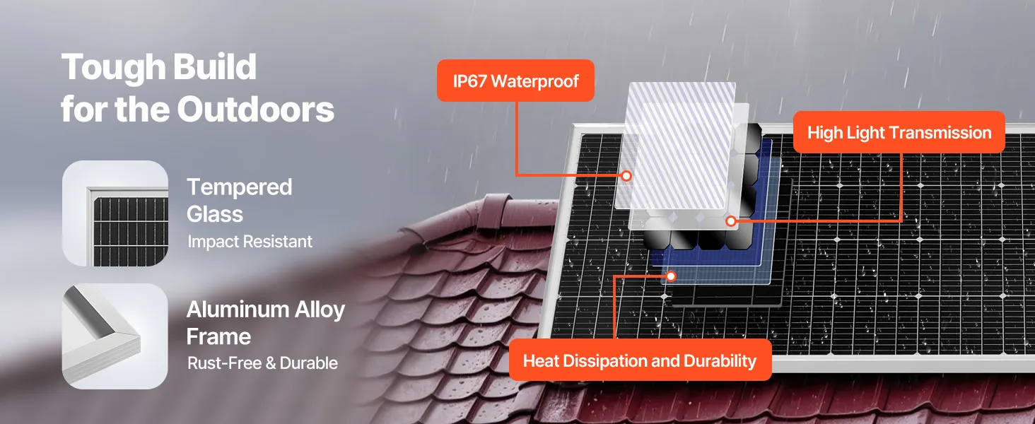 Monokryštalické solárne články s vysokou účinnosťou zabezpečujú vynikajúcu konverziu energie. Vďaka vodotesnosti IP67 sú spoľahlivé na dlhodobé používanie vo vonkajšom prostredí.