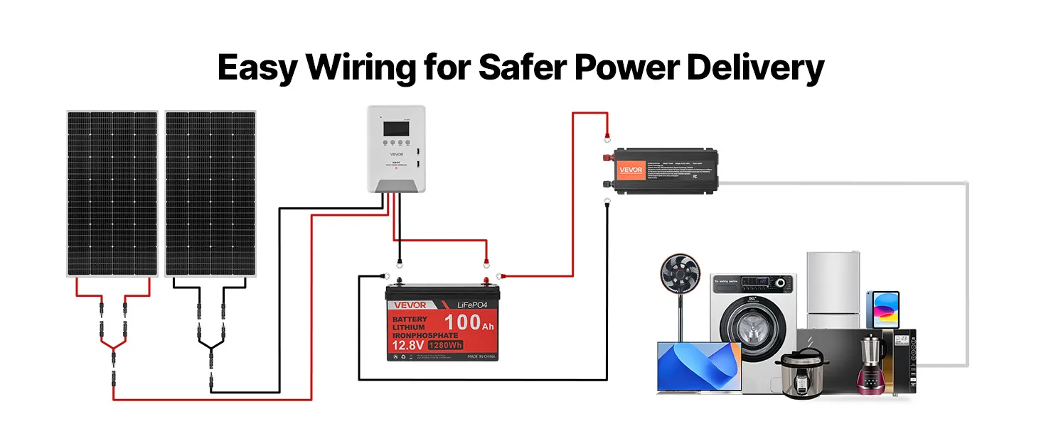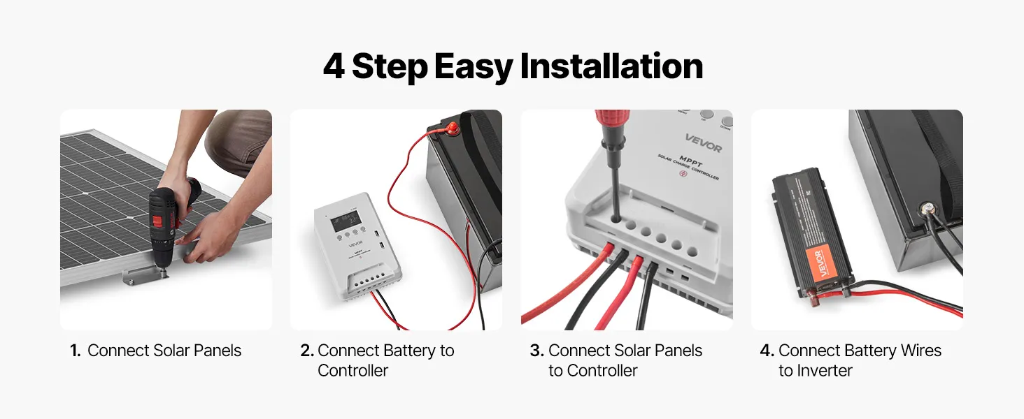 Obsahuje podrobné pokyny na zapojenie, ktoré vám umožnia rýchlo pripojiť batériu, solárne panely, regulátor a menič.