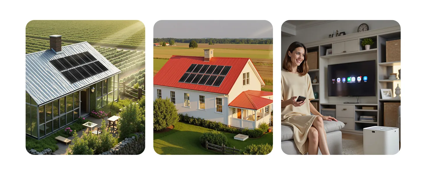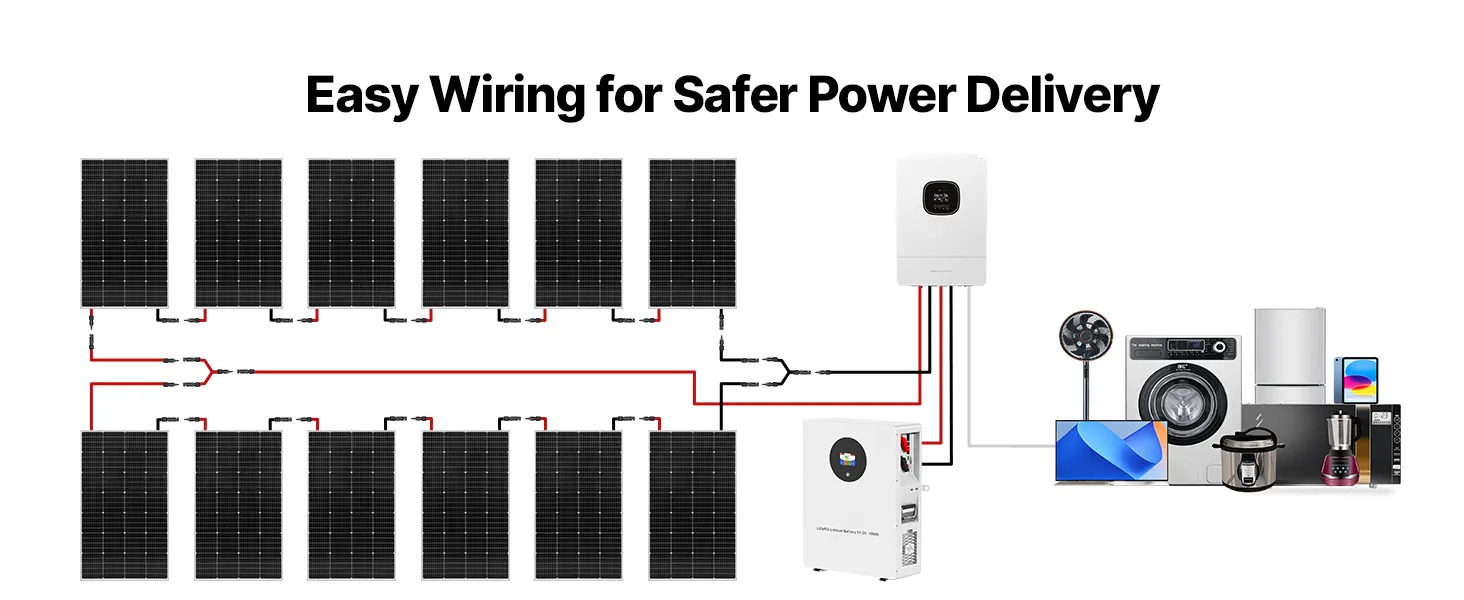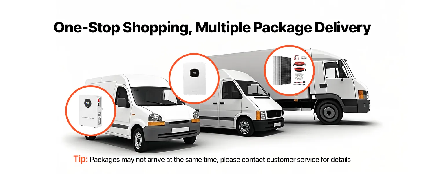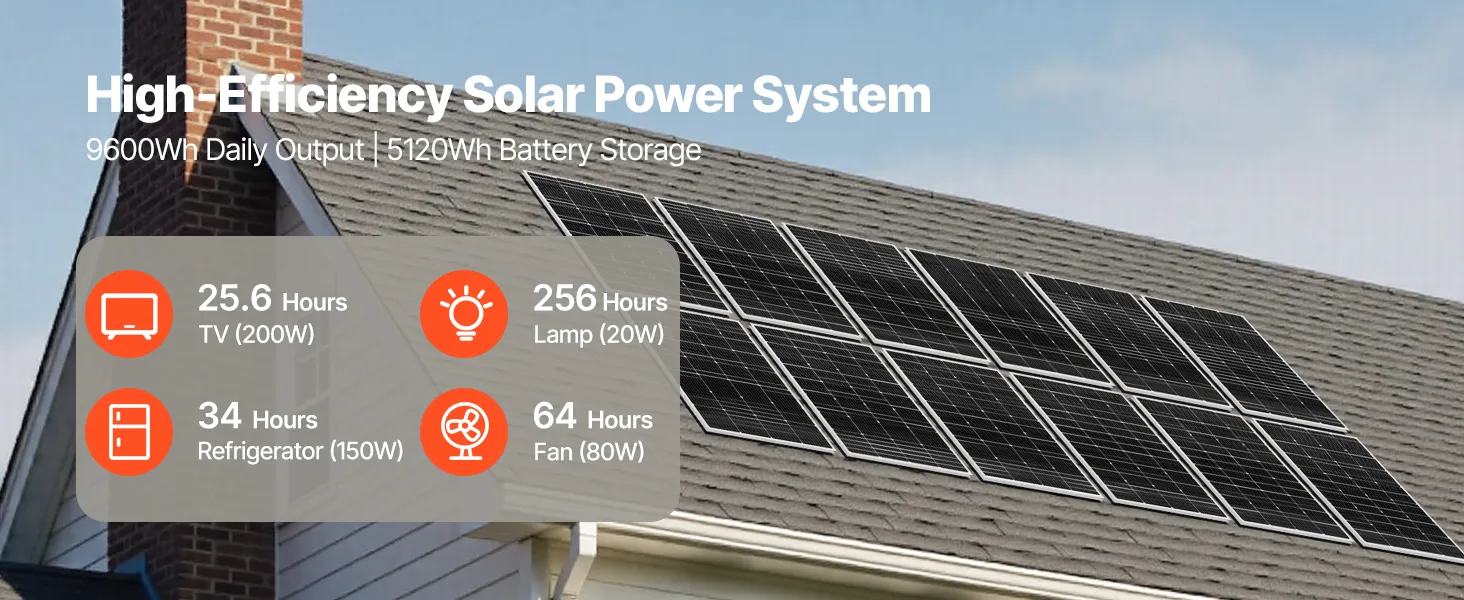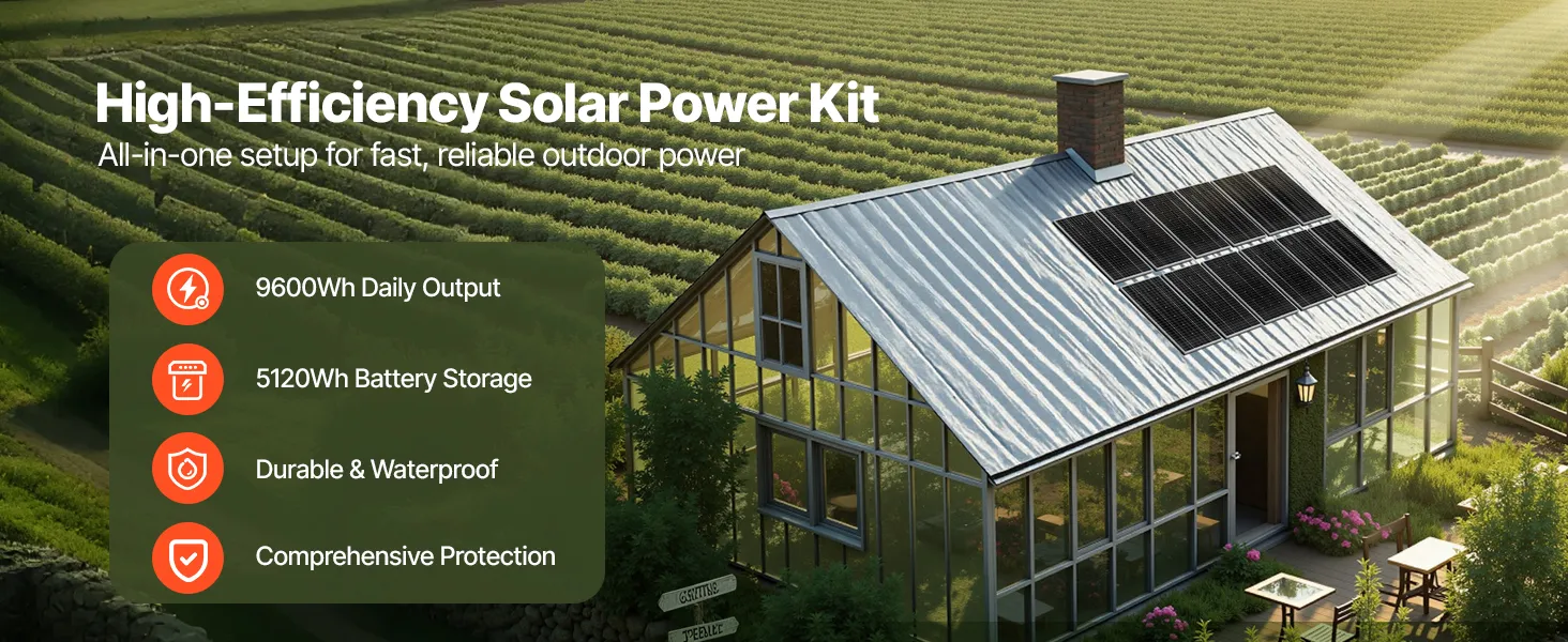 Táto súprava solárnej energie obsahuje 12 ks 200W solárnych panelov, 51,2V 100Ah LiFePO₄ batériu a 48V 5000W hybridný solárny menič. S výkonom až 9600Wh/deň a 5120Wh akumulátorom poskytuje vysoký výkon na efektívne napájanie veľkých domov, prístreškov, fariem a spotrebičov s vysokou spotrebou.
