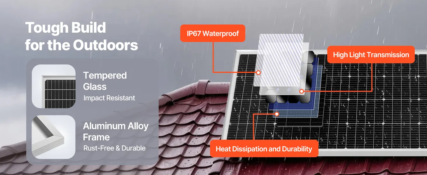 Monokryštalické solárne články s vysokou účinnosťou zabezpečujú vynikajúcu konverziu energie. Vďaka vodotesnosti IP67 sú spoľahlivé na dlhodobé používanie vo vonkajšom prostredí.