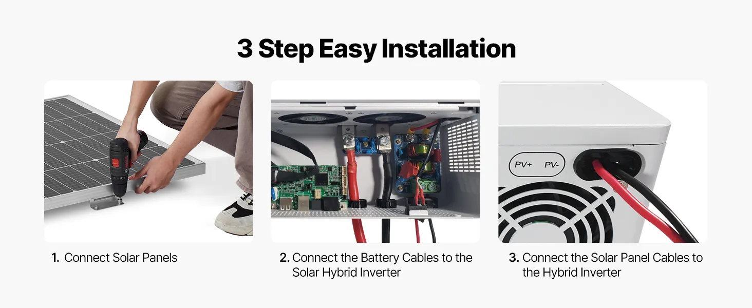 Obsahuje podrobné pokyny na zapojenie, ktoré vám umožnia rýchlo pripojiť batériu, solárne panely a solárny hybridný menič.