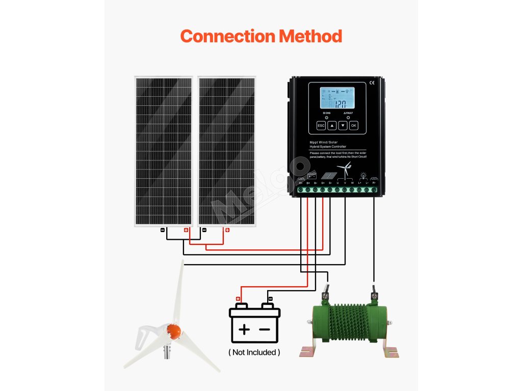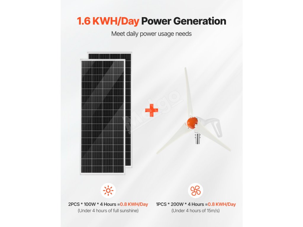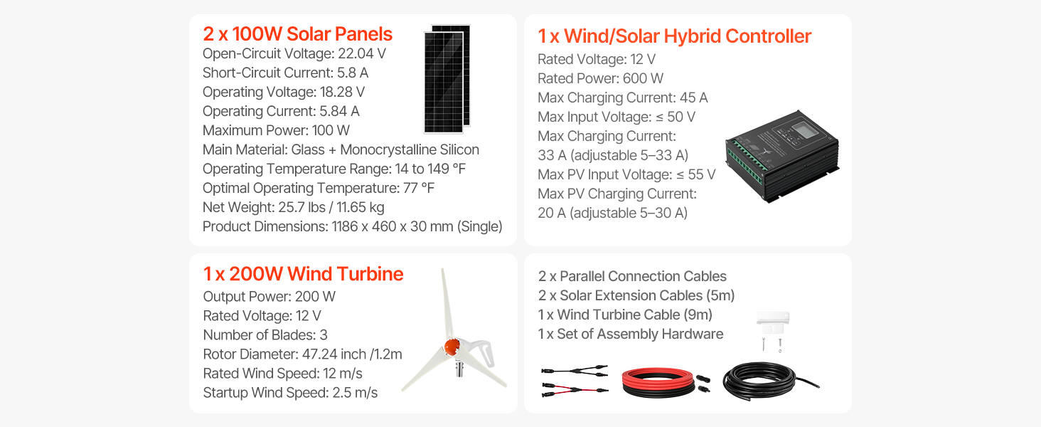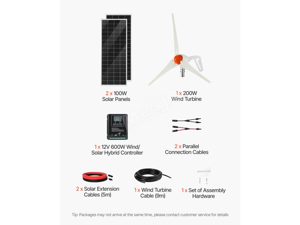 Jednoduchá inštalácia. Obsahuje 2 x 100W solárne panely, 1 x 200W veternú turbínu, 1 x MPPT regulátor hybridného systému vetra a slnka, 2 x káble na paralelné pripojenie, 2 x predlžovacie káble na solárnu energiu (5 m), 1 x kábel na veternú turbínu (9 m), 1 x sadu montážneho príslušenstva.