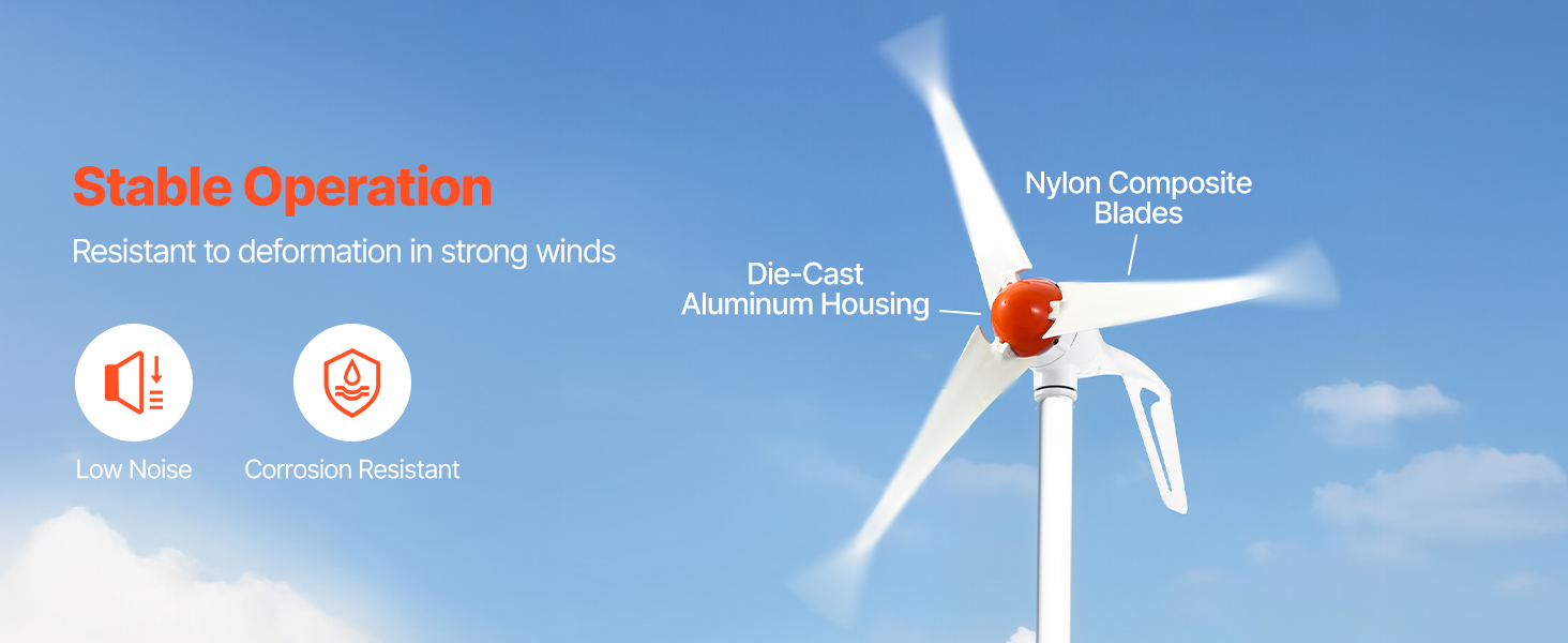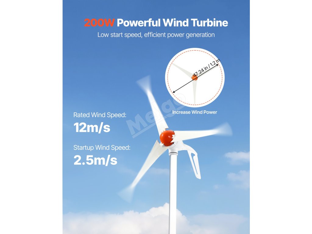 Vďaka nízkej štartovacej rýchlosti 2,5 m/s, menovitej rýchlosti 12 m/s a priemeru rotora 1,2 m táto 200W veterná turbína zabezpečuje stabilnú výrobu energie aj pri slabom vetre a zachováva spoľahlivý výkon v rôznych prostrediach.