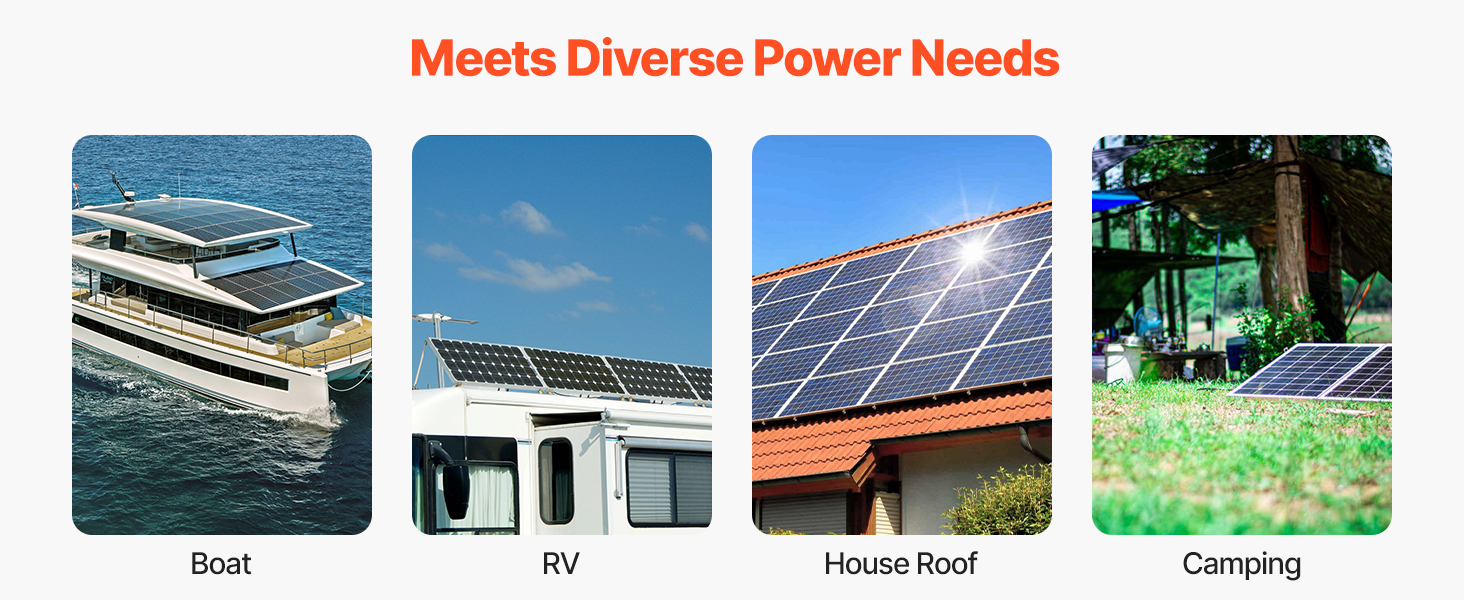 Táto 12 V 400 W solárna súprava, vhodná pre lode, obytné vozidlá, strechy domov a kempovanie, ľahko splní vaše rôznorodé energetické potreby a umožní vám kedykoľvek si užívať čistú energiu. (Teplá pripomienka: Balenia nemusia prísť v rovnakom čase; buďte trpezliví a počkajte alebo kontaktujte zákaznícky servis pre viac informácií)