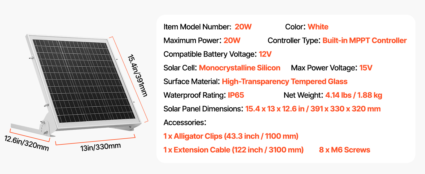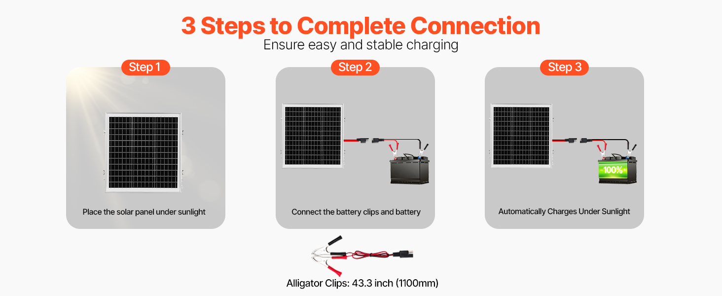 Táto nabíjačka batérií so solárnym panelom sa dodáva so 122-palcovým predlžovacím káblom a 43,3-palcovými krokosvorkami. Na rýchle nabíjanie stačí pripojiť k vašej 12 V batérii.