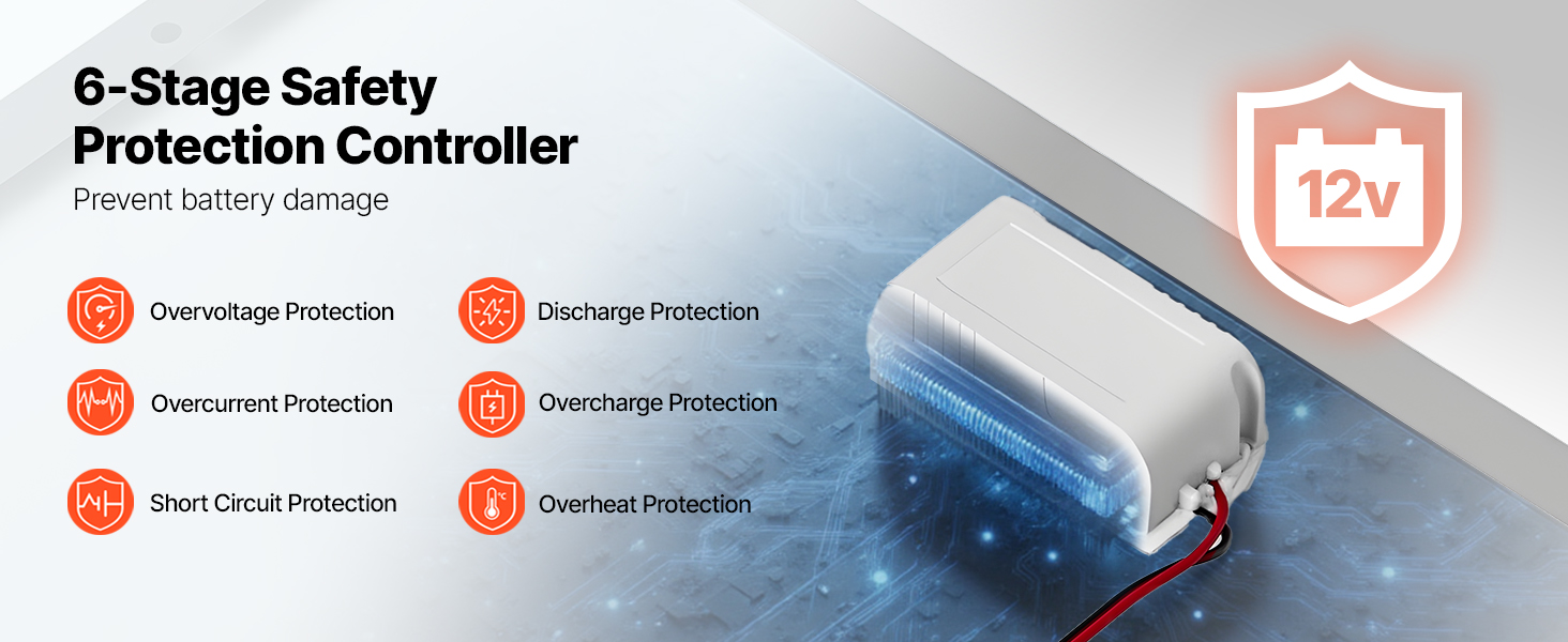 Udržiavač solárnych batérií je zabudovaný inteligentný regulátor MPPT, ktorý poskytuje viacero vrstiev ochrany. Zabezpečuje optimalizovanú účinnosť nabíjania a zároveň chráni batériu a solárny systém.