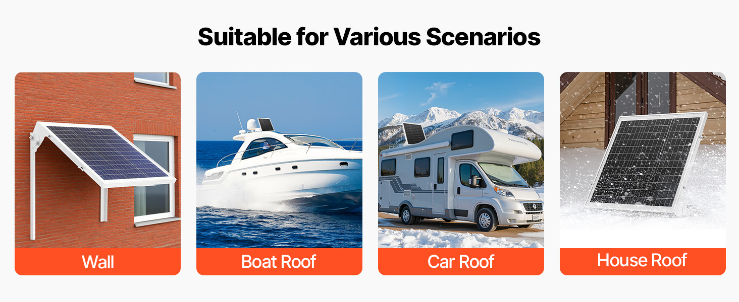 Táto súprava na nabíjanie batérií solárnym panelom je vybavená nastaviteľným držiakom v uhle 0°-60°, skrutkami M6 a predvŕtanými otvormi na bezpečnú dlhodobú inštaláciu na steny, paluby lodí, strechy automobilov, strechy domov a ďalšie miesta, vďaka čomu bude vaše zariadenie kedykoľvek napájané.