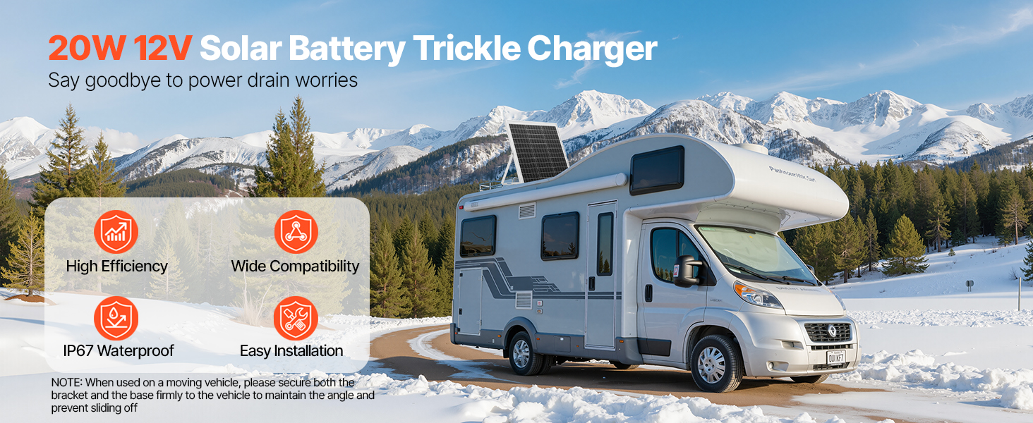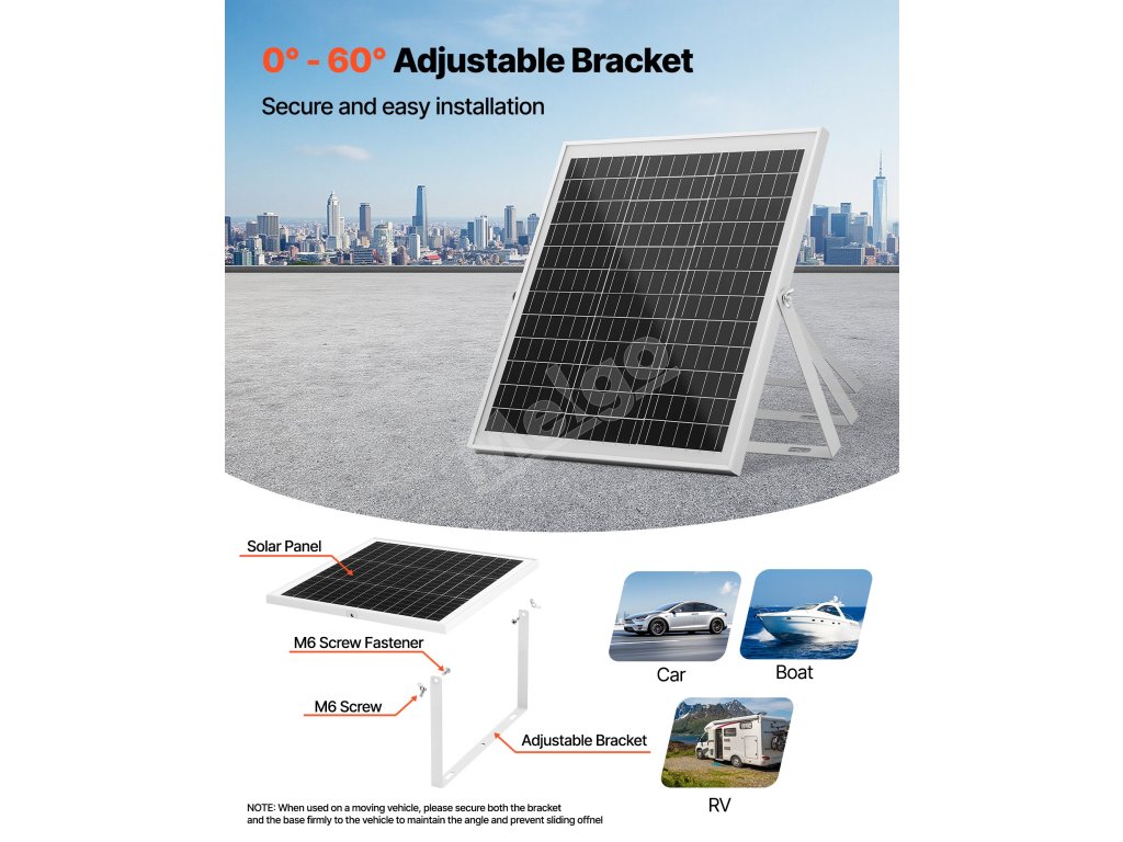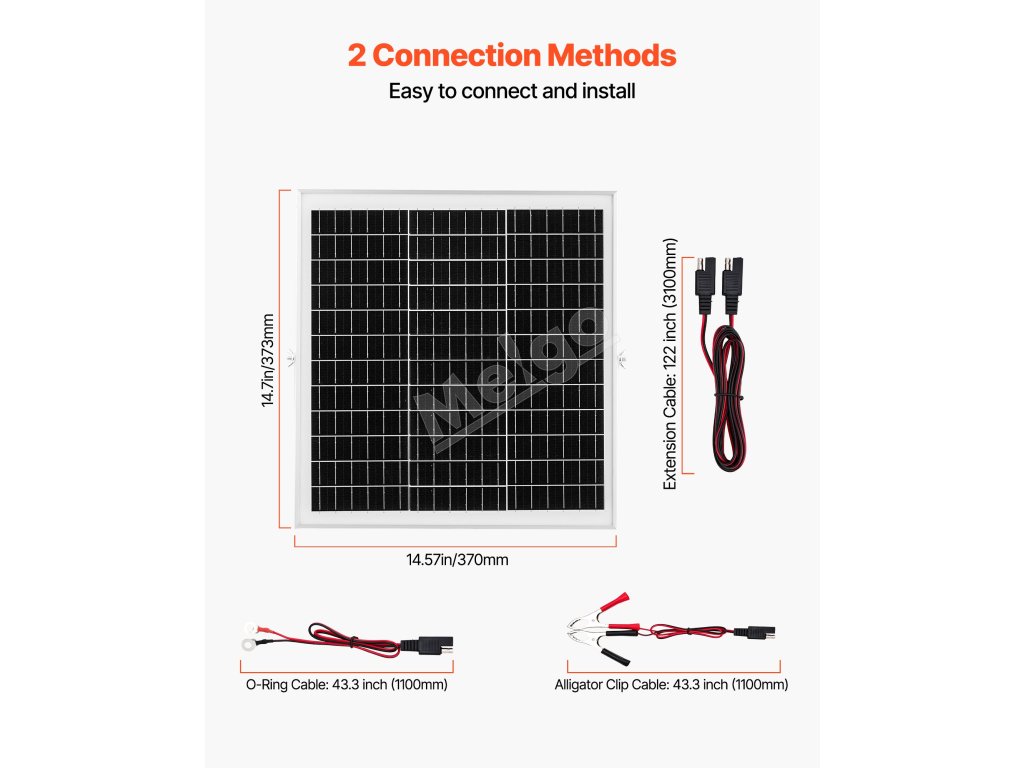 Táto súprava na nabíjanie batérií so solárnym panelom je kompatibilná s rôznymi 12 V batériami a poskytuje spoľahlivé riešenie na nabíjanie batérií. (Pri použití na pohybujúcom sa vozidle pevne pripevnite držiak aj základňu k vozidlu, aby ste zachovali uhol a zabránili skĺznutiu)