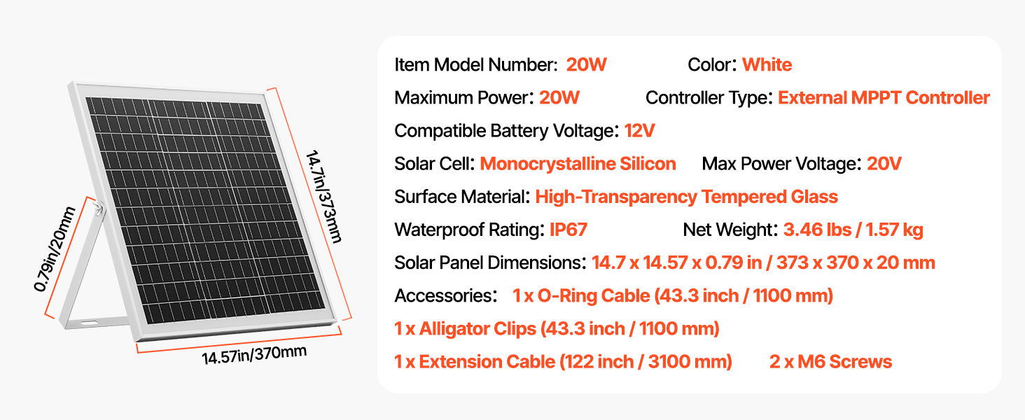 Rozlúčte sa s vybitými batériami! Naša 20W solárna nabíjačka na 12V batérie využíva slnečnú energiu na spoľahlivé napájanie vašich 12V batérií. Je skonštruovaný s vysokoúčinnými monokryštalickými solárnymi článkami a zabezpečuje stabilné nabíjanie a údržbu pre autá, obytné vozidlá, lode a ďalšie