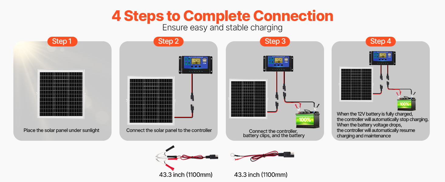 Obsahuje 122-palcový predlžovací kábel a dva pripojovacie káble: 43.3-palcový (1100 mm) kábel s O-krúžkom a 43,3-palcové (1100 mm) krokosvorky. Jednoducho zapojte a použite na rýchle a spoľahlivé nabíjanie batérií