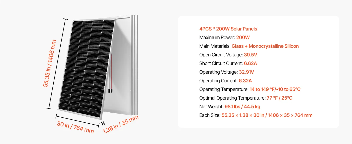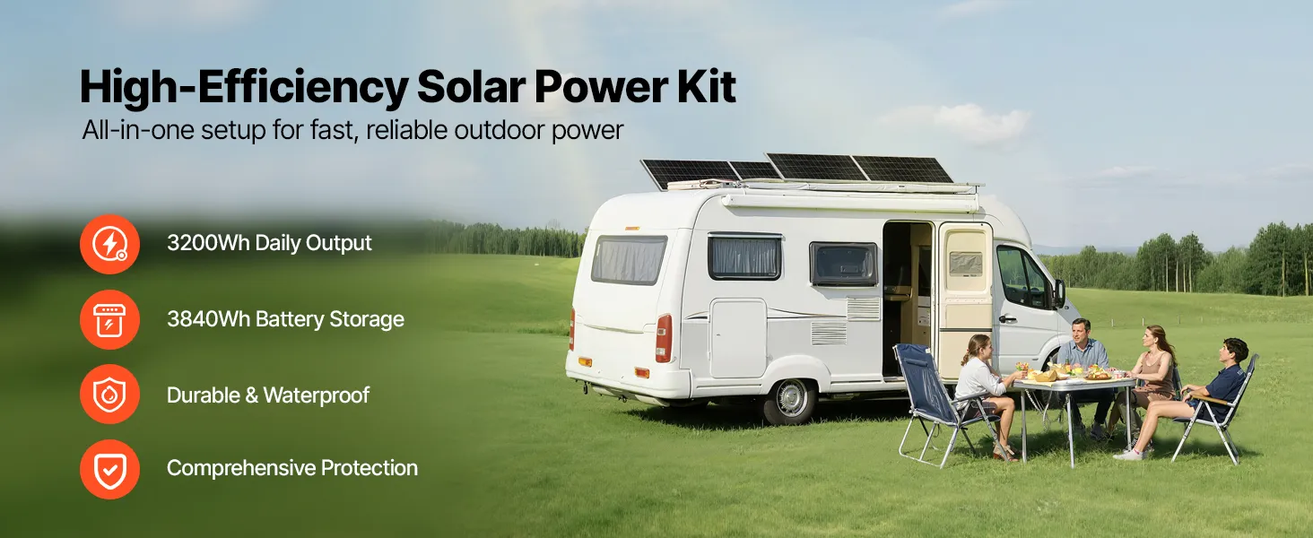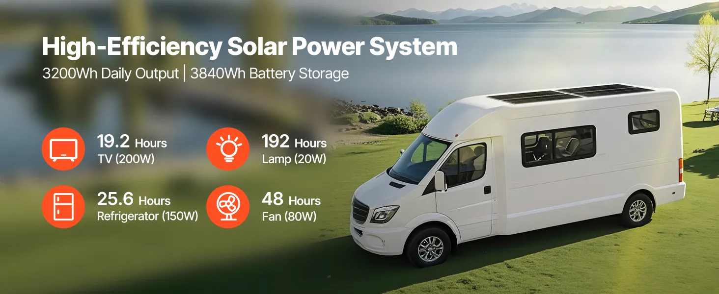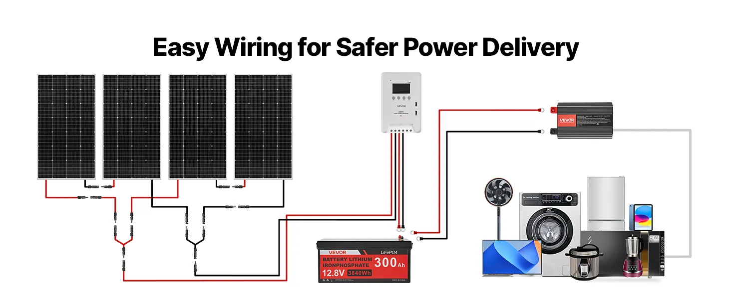 Táto súprava solárnej energie obsahuje 4 ks 200W monokryštalických solárnych panelov, 12,8V 300Ah LiFePO₄ batériu, 60A MPPT solárny regulátor nabíjania a 12V 2000W striedač. S výkonom až 3200Wh/deň a 3840Wh akumulátorom poskytuje spoľahlivé napájanie pre lode, chaty, domy, farmy a ďalšie zariadenia.