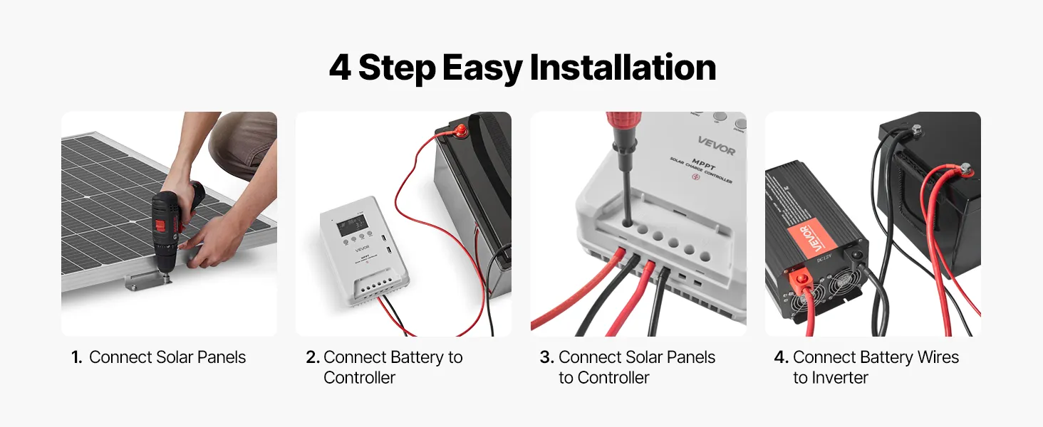 Obsahuje podrobné pokyny na zapojenie, ktoré vám umožnia rýchlo pripojiť batériu, solárne panely, regulátor a menič.