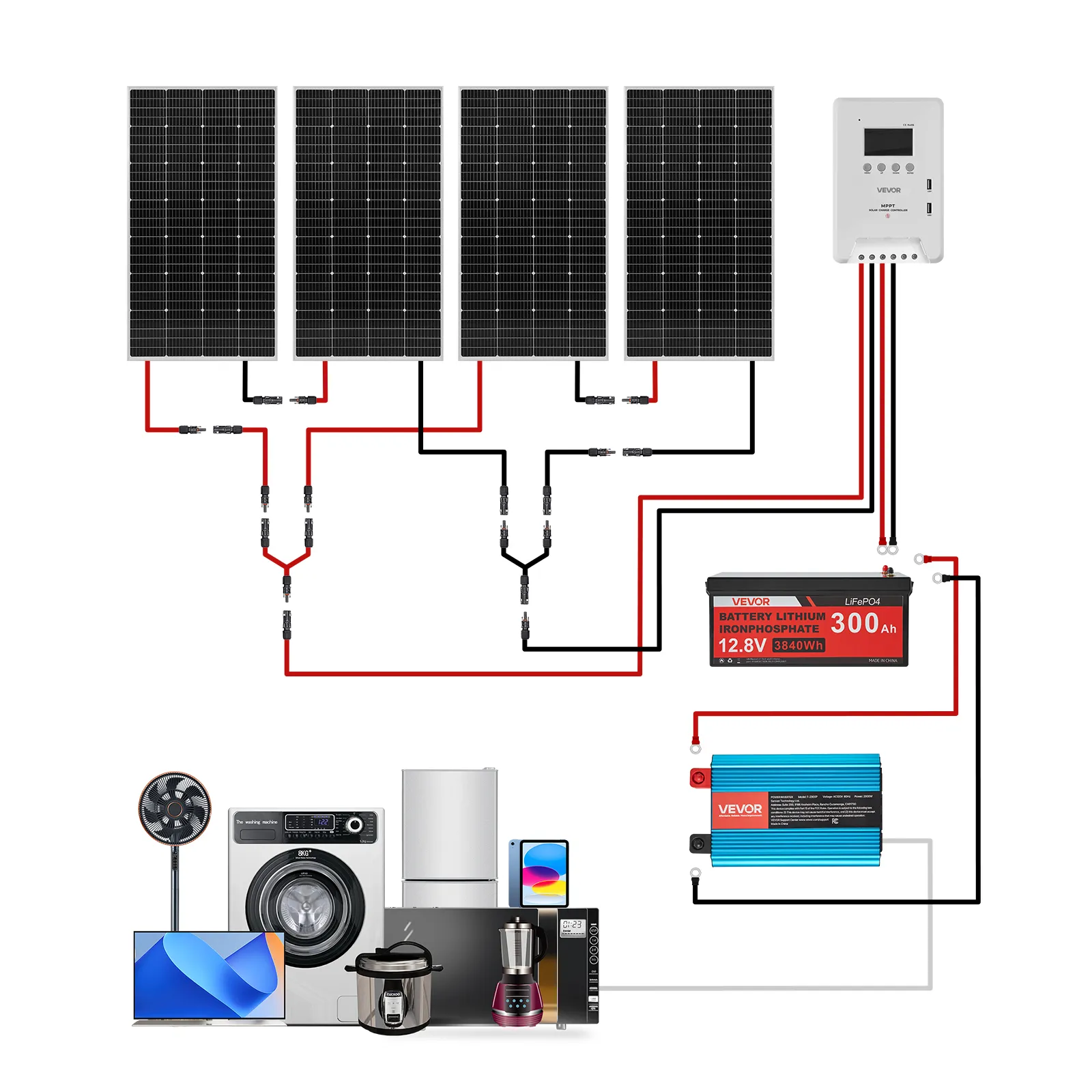 Solárny set 800W 4×200W, 12.8V 300Ah LiFePO4, 60A mppt, 2000W menič