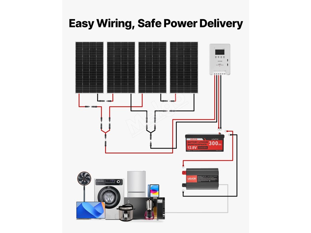 Obsahuje podrobné pokyny na zapojenie, ktoré vám umožnia rýchlo pripojiť batériu, solárne panely, regulátor a menič.