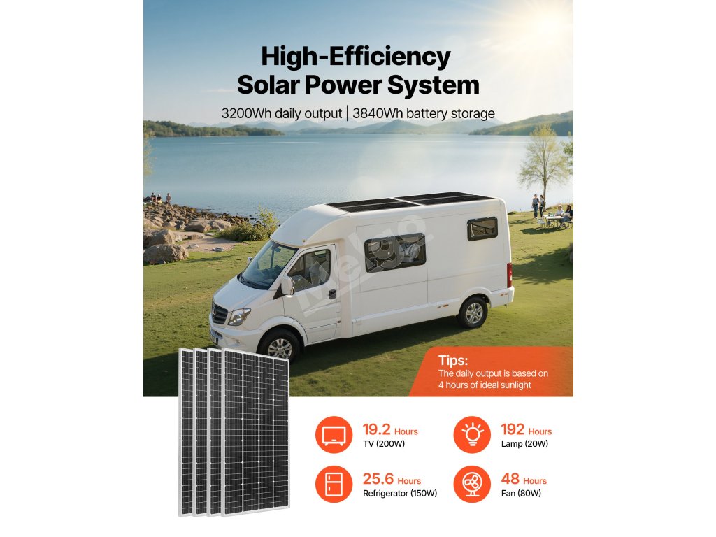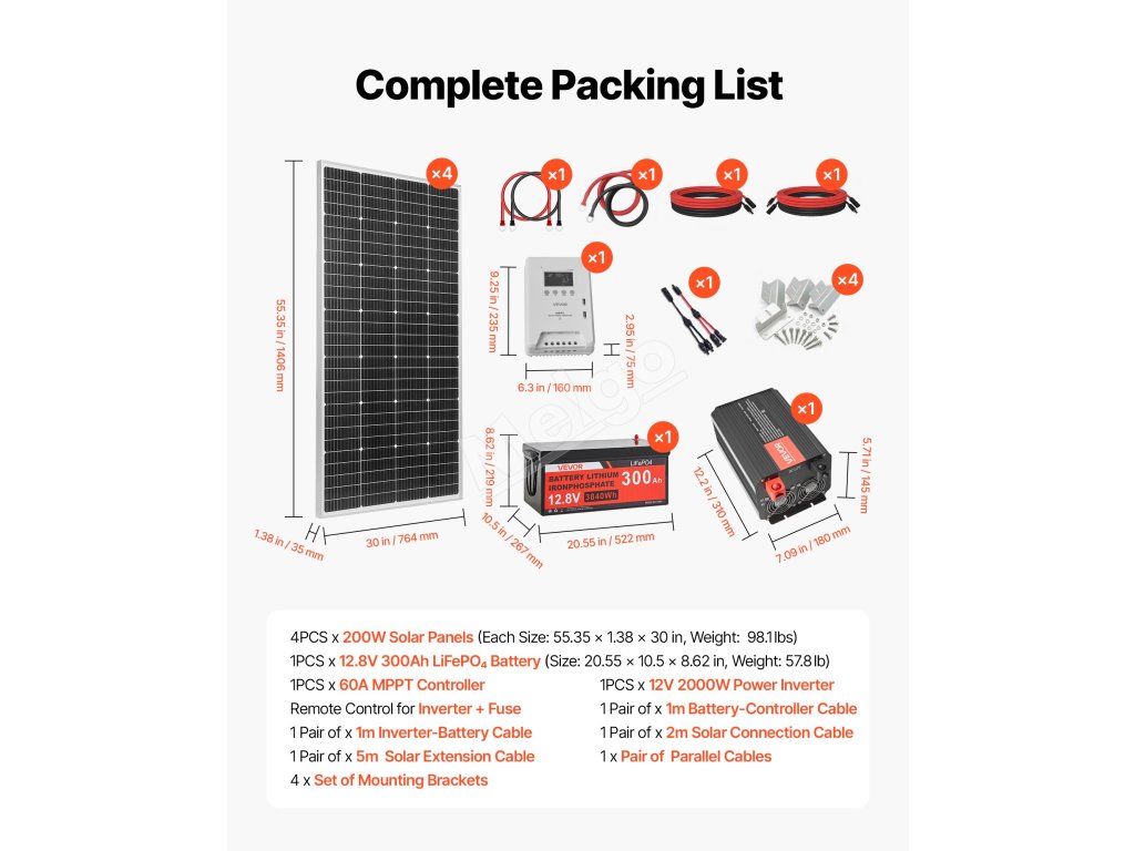 Táto súprava solárnej energie obsahuje 4 ks 200W monokryštalických solárnych panelov, 12,8V 300Ah LiFePO₄ batériu, 60A MPPT solárny regulátor nabíjania a 12V 2000W striedač. S výkonom až 3200Wh/deň a 3840Wh akumulátorom poskytuje spoľahlivé napájanie pre lode, chaty, domy, farmy a ďalšie zariadenia.