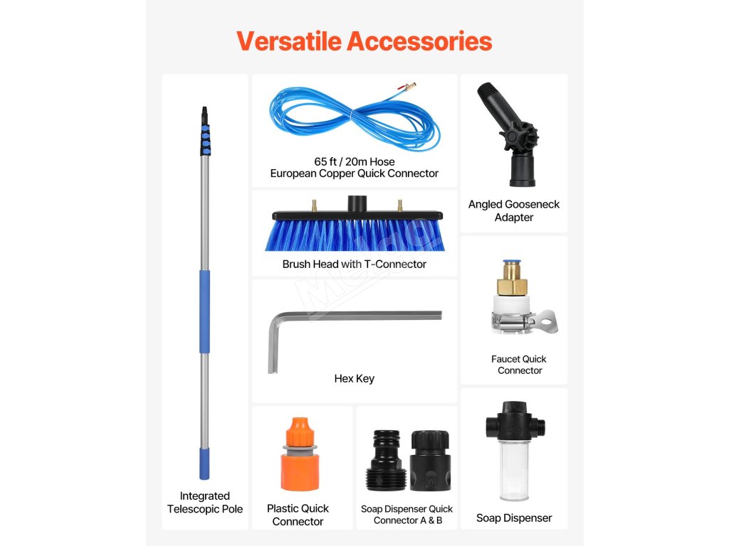 Dodáva sa s rôznymi rýchlospojkami, ktoré sú vhodné pre štandardné záhradné hadice. Hadica obsahuje uzatvárací ventil a dosahuje dĺžku 65,6 stopy (20 m) - ideálna pre každú situáciu. Čistite kefou solárne panely bez obáv o dĺžku alebo kompatibilitu. Rozlúčte sa s neporiadnymi prípojkami!