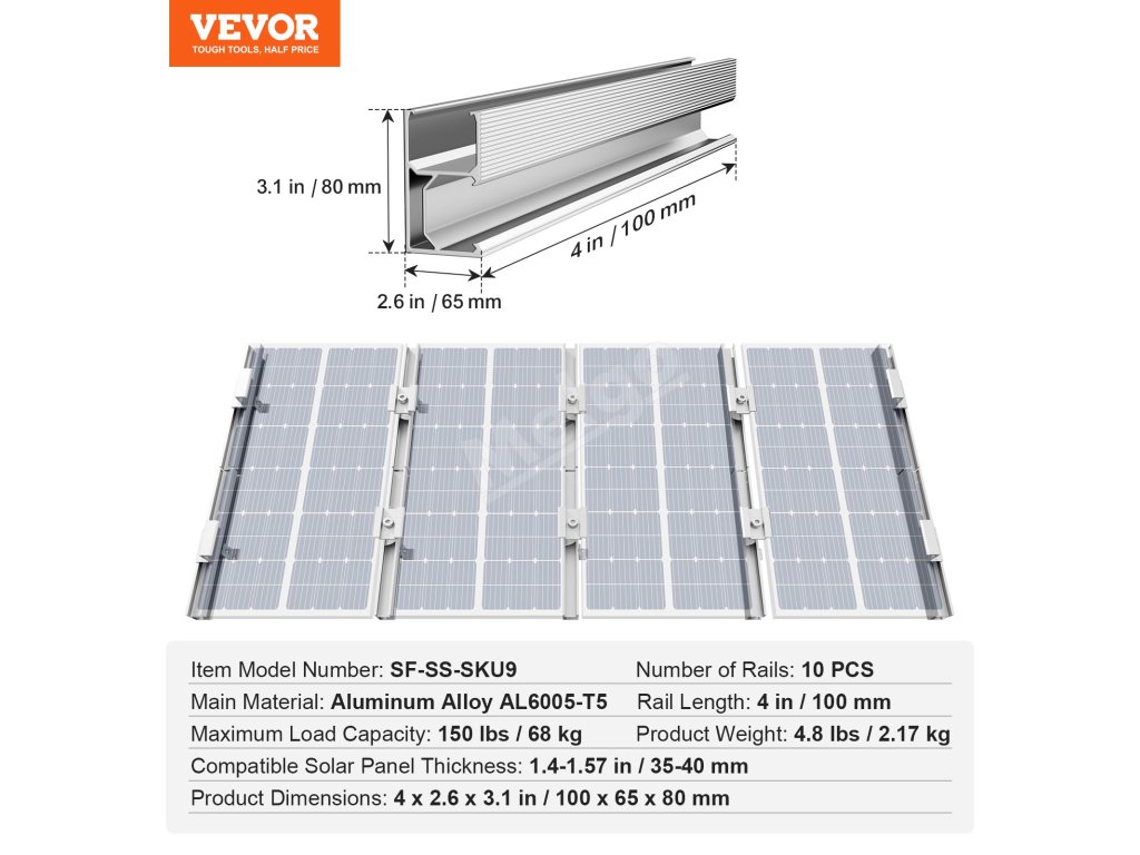 Vyberte si montážnu konzolu VEVOR na solárne panely pre spoľahlivú a stabilnú montáž. nastaviteľná koncová svorka s priemerom 35 až 40 mm sa prispôsobí rôznym hrúbkam solárnych panelov a konštrukcia z eloxovanej hliníkovej zliatiny poskytuje dlhodobú stabilitu, takže je ideálnou voľbou na inštaláciu solárnych panelov.