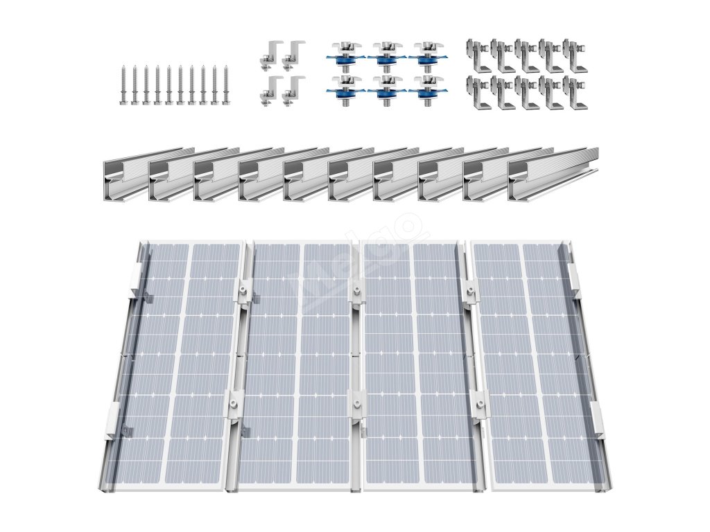 Náš systém montáže solárnych panelov obsahuje 10 vodiacich líšt (4-palcové), 4 koncové svorky, 6 miernych svoriek a sadu príslušenstva, ktoré poskytujú stabilnú montáž pre vaše solárne panely a zároveň zvyšujú celkovú stabilitu a dlhodobý výkon.