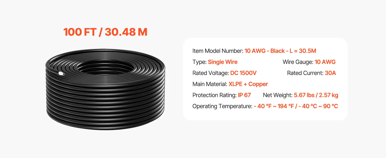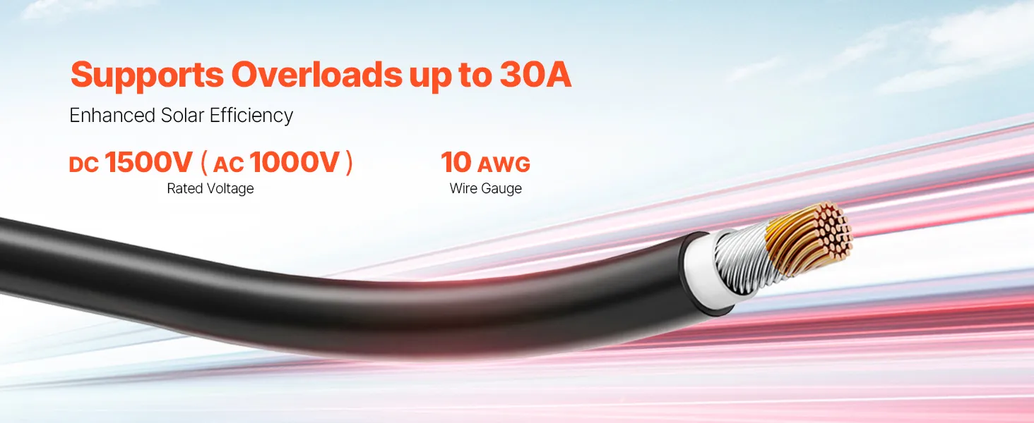 A:Najprv sa uistite, že menovité hodnoty prúdu a napätia kábla zodpovedajú špecifikáciám solárneho systému. Tento kábel má 10 AWG.