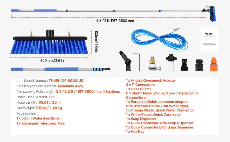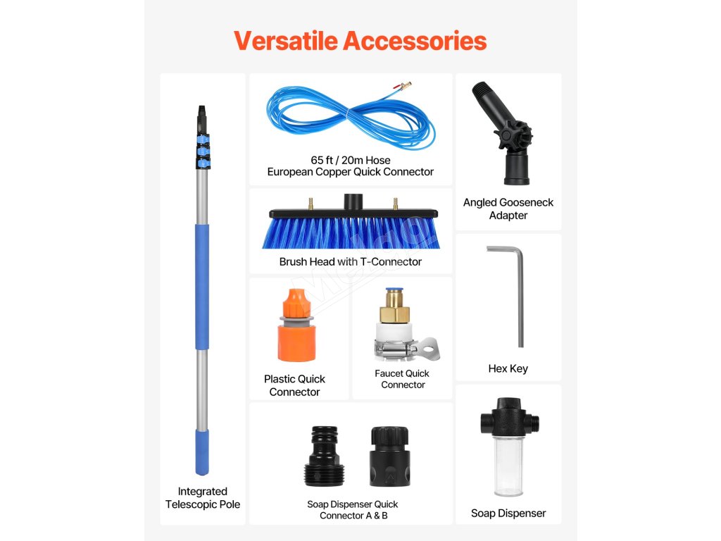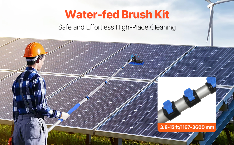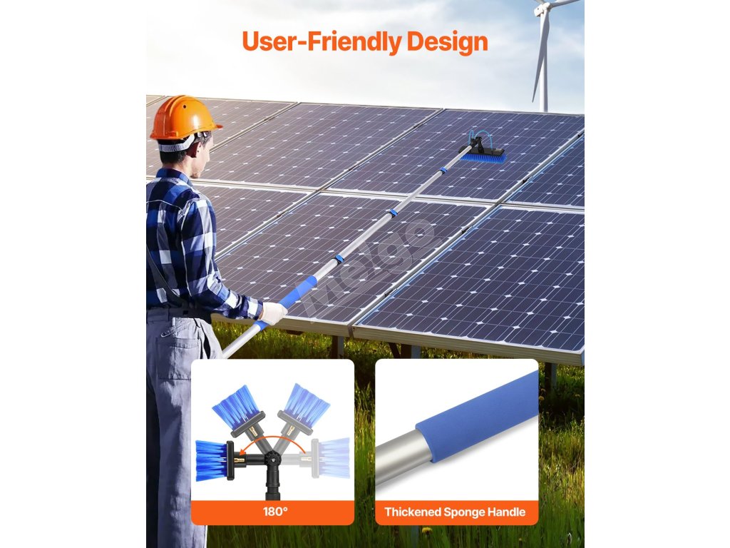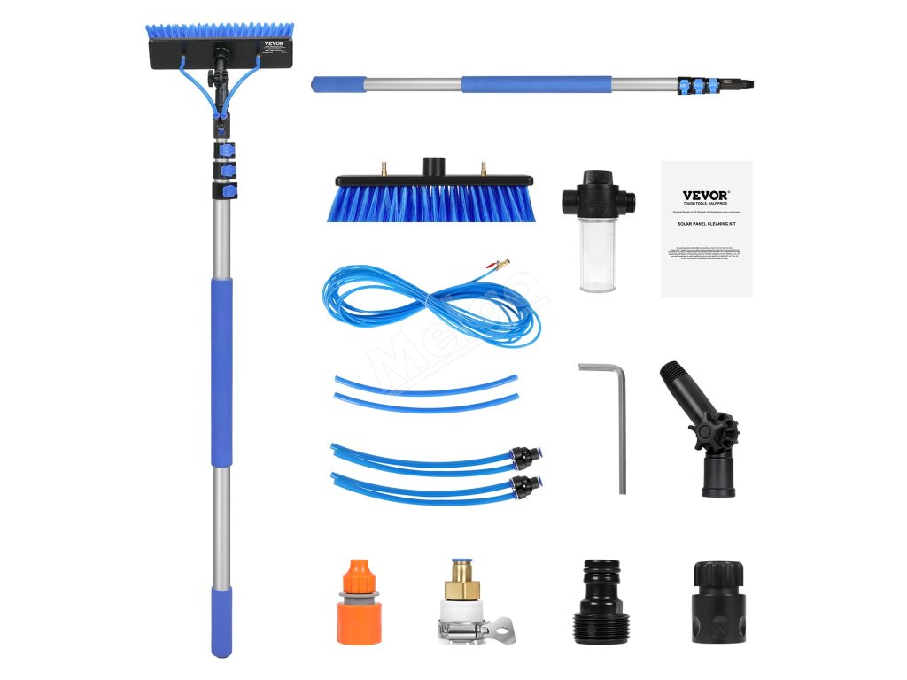 Dodáva sa s rôznymi rýchlospojkami, ktoré sú vhodné pre štandardné záhradné hadice. Hadica obsahuje uzatvárací ventil a dosahuje dĺžku 65,6 stopy (20 m) - ideálna pre každú situáciu. Čistite kefou solárne panely bez obáv o dĺžku alebo kompatibilitu. Rozlúčte sa s neporiadnymi prípojkami!