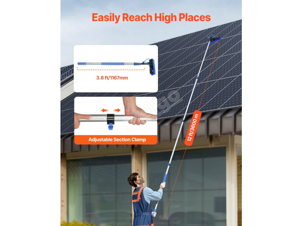 Tyč na čistenie solárnych panelov 3.6m, otočná hlava 180°, hadica 20m