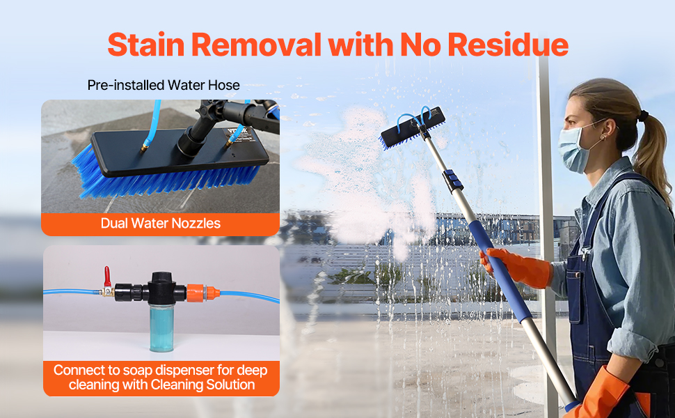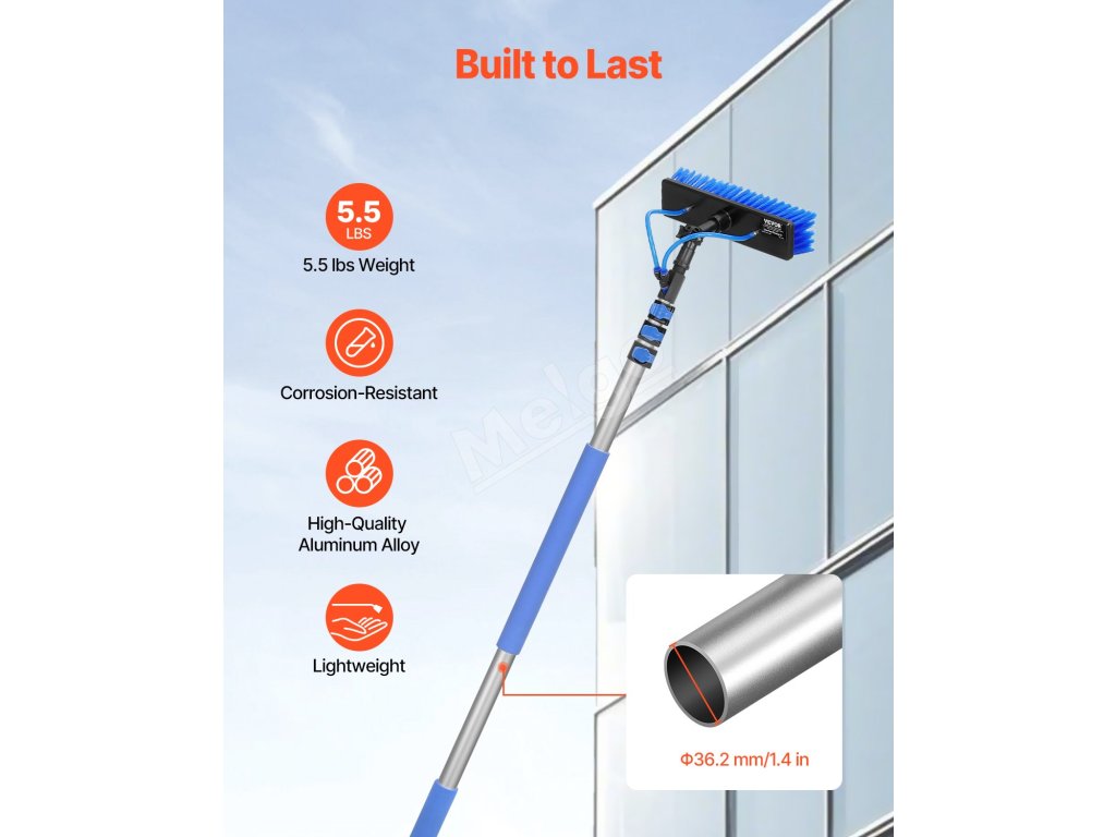 2 vodné trysky poskytujú silný prúd na čistenie bez námahy. Ak chcete čistiť dôkladnejšie, jednoducho sa pripojte k dávkovaču mydla a ľahko si poradíte s odolnými škvrnami. Táto súprava tyčového čističa s prívodom vody, ktorá je ideálna na lesklé okná, solárne panely a ďalšie zariadenia, umožňuje jednoduché a pohodlné čistenie.