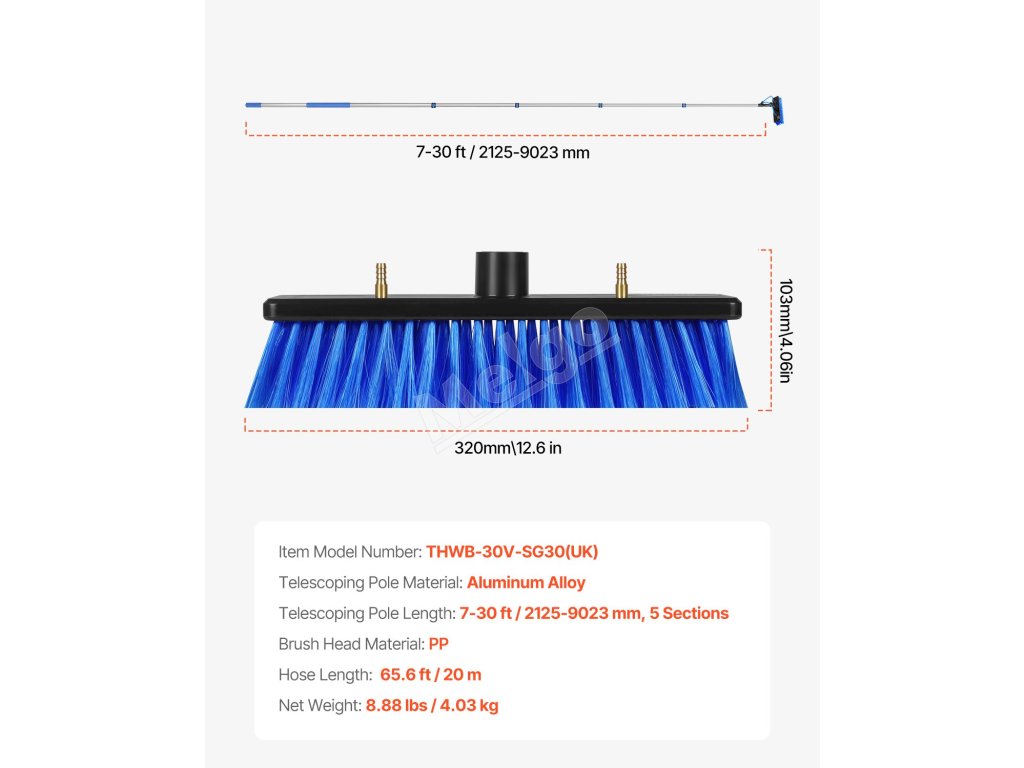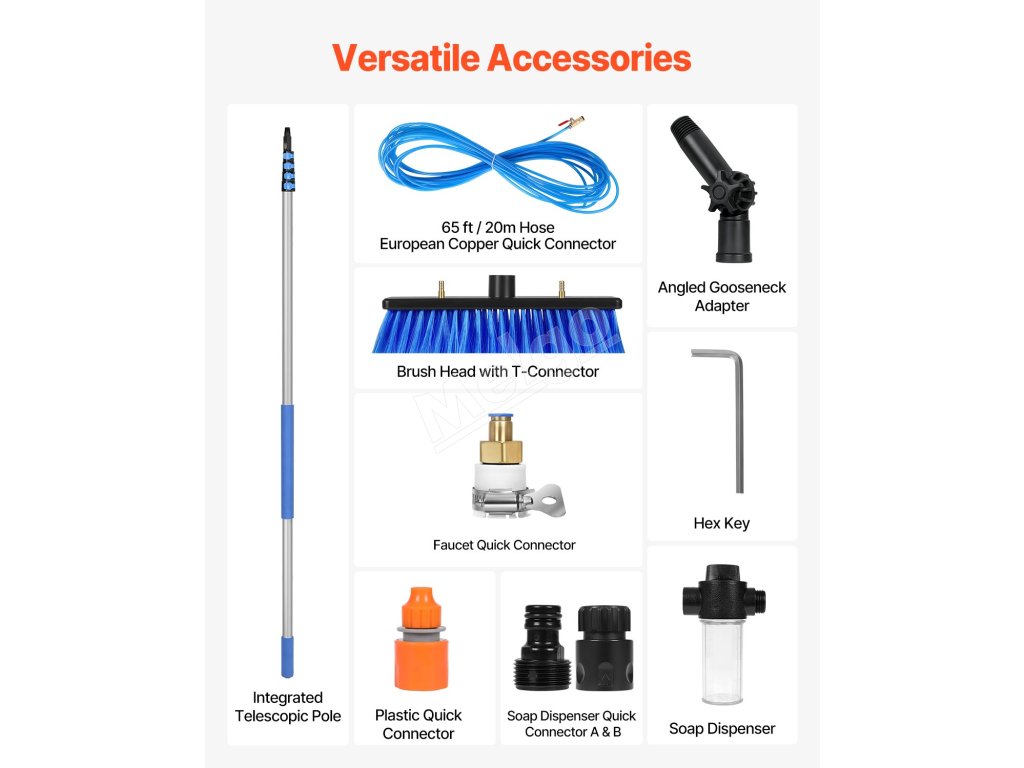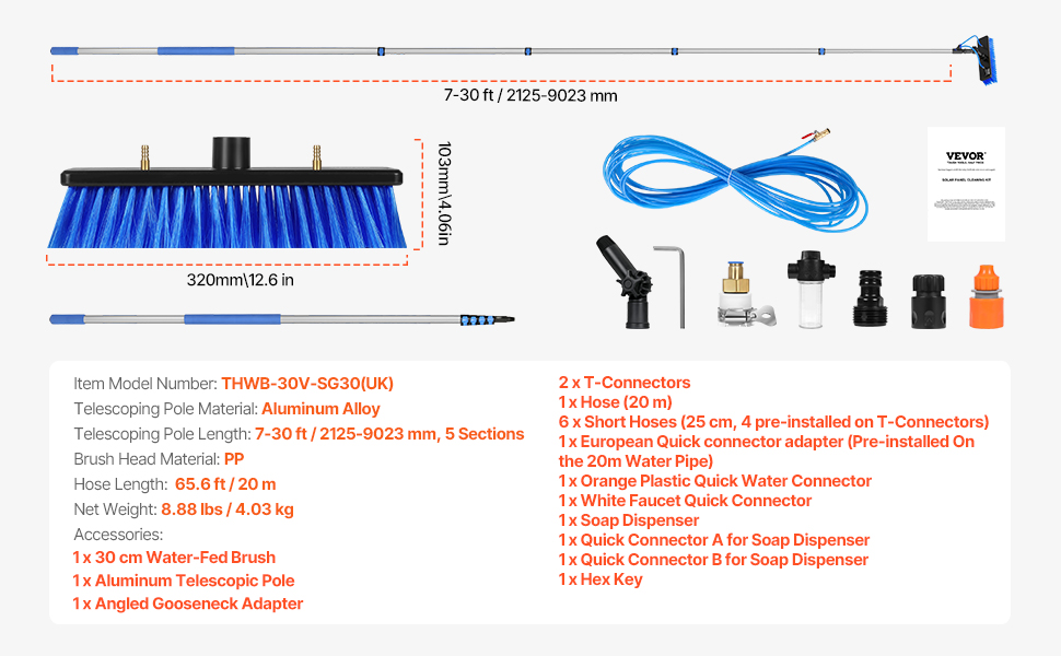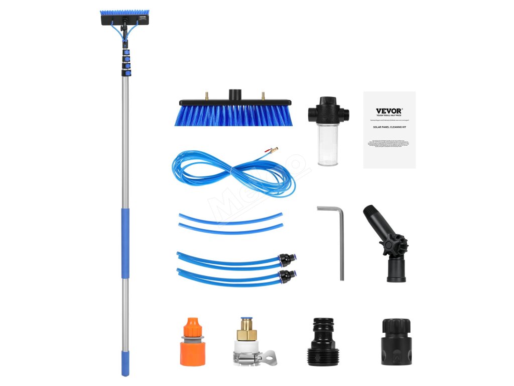Dodáva sa s rôznymi rýchlospojkami, ktoré sú vhodné pre štandardné záhradné hadice. Hadica obsahuje uzatvárací ventil a dosahuje dĺžku 65,6 stopy (20 m) - ideálna pre každú situáciu. Čistite kefou solárne panely bez obáv o dĺžku alebo kompatibilitu. Rozlúčte sa s neporiadnymi prípojkami!