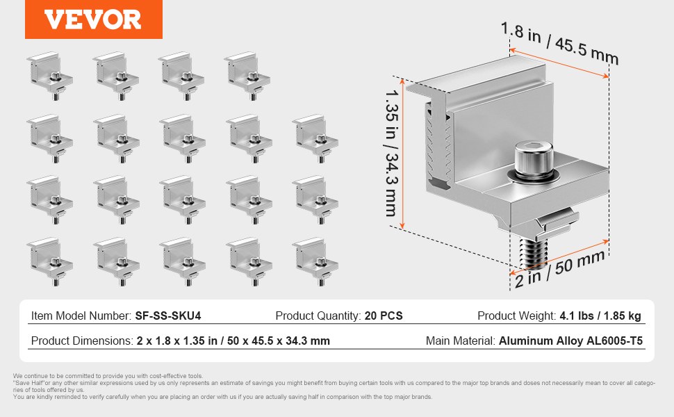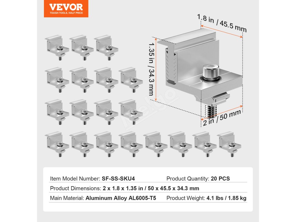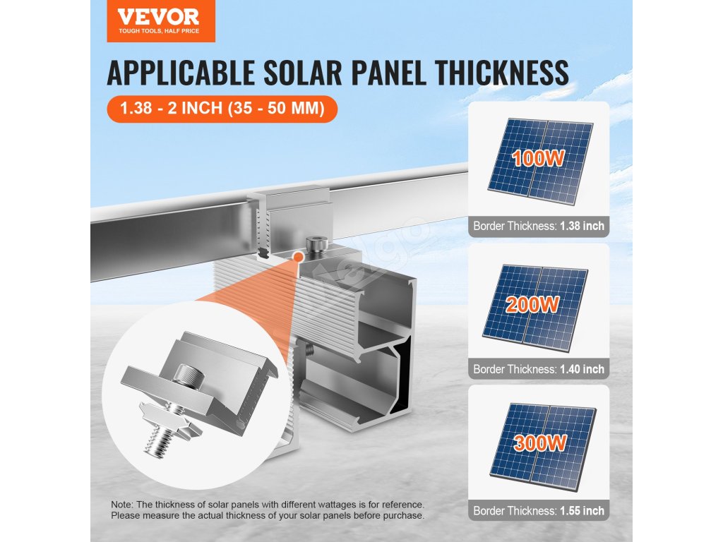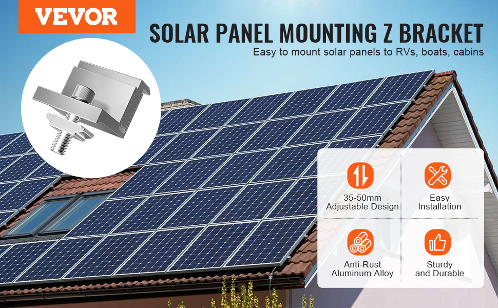 Vyberte si montážnu konzolu Z solárneho panelu VEVOR pre spoľahlivú a stabilnú montáž. nastaviteľná koncová svorka s priemerom 35 až 50 mm sa prispôsobí rôznym hrúbkam solárnych panelov a konštrukcia z eloxovanej hliníkovej zliatiny poskytuje dlhodobú stabilitu, takže je ideálnou voľbou na inštaláciu solárnych panelov.