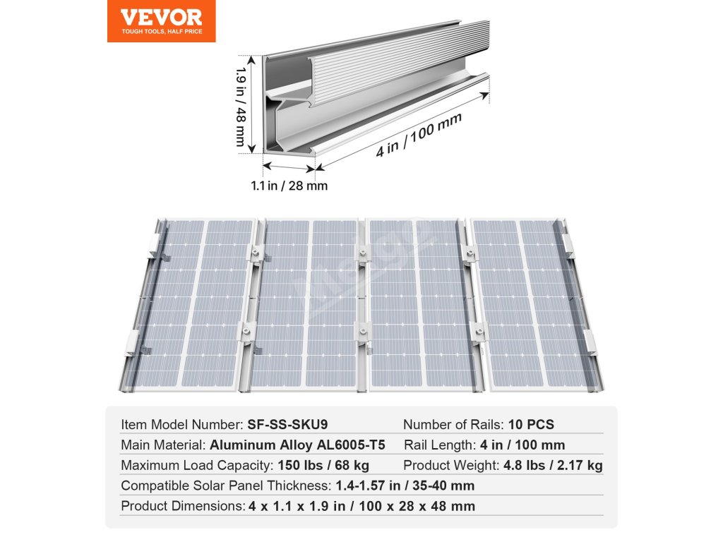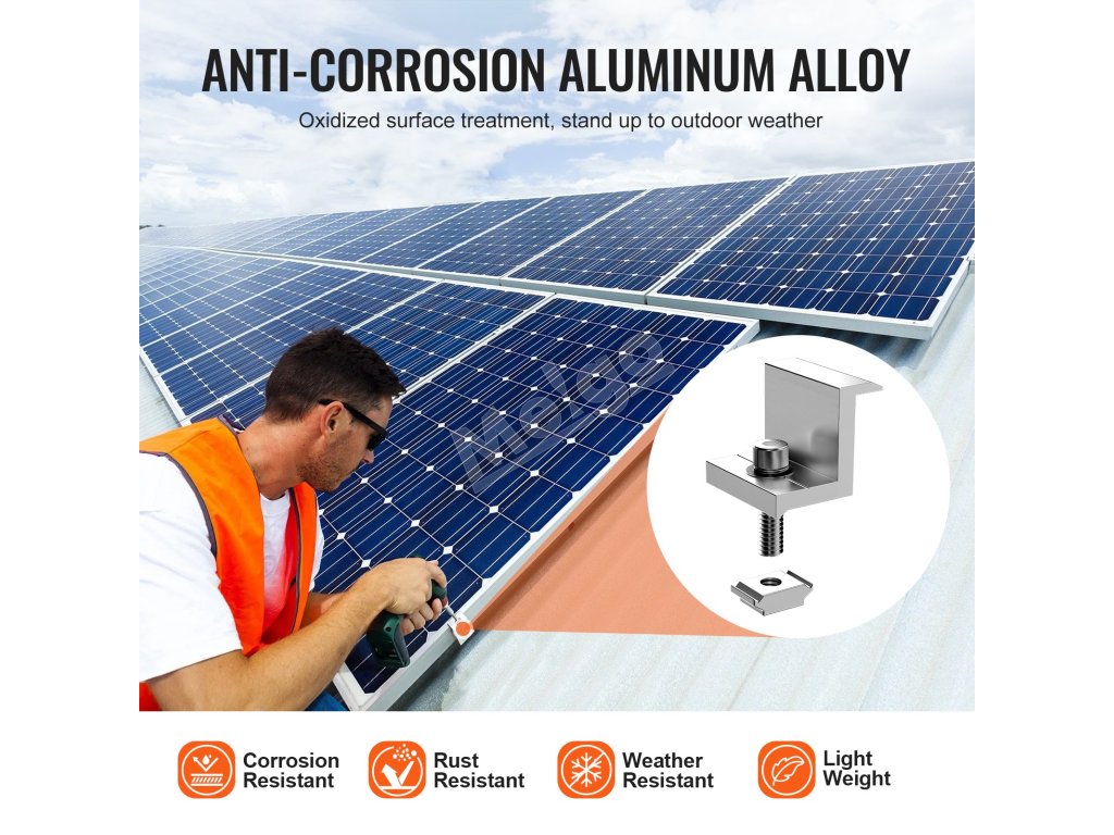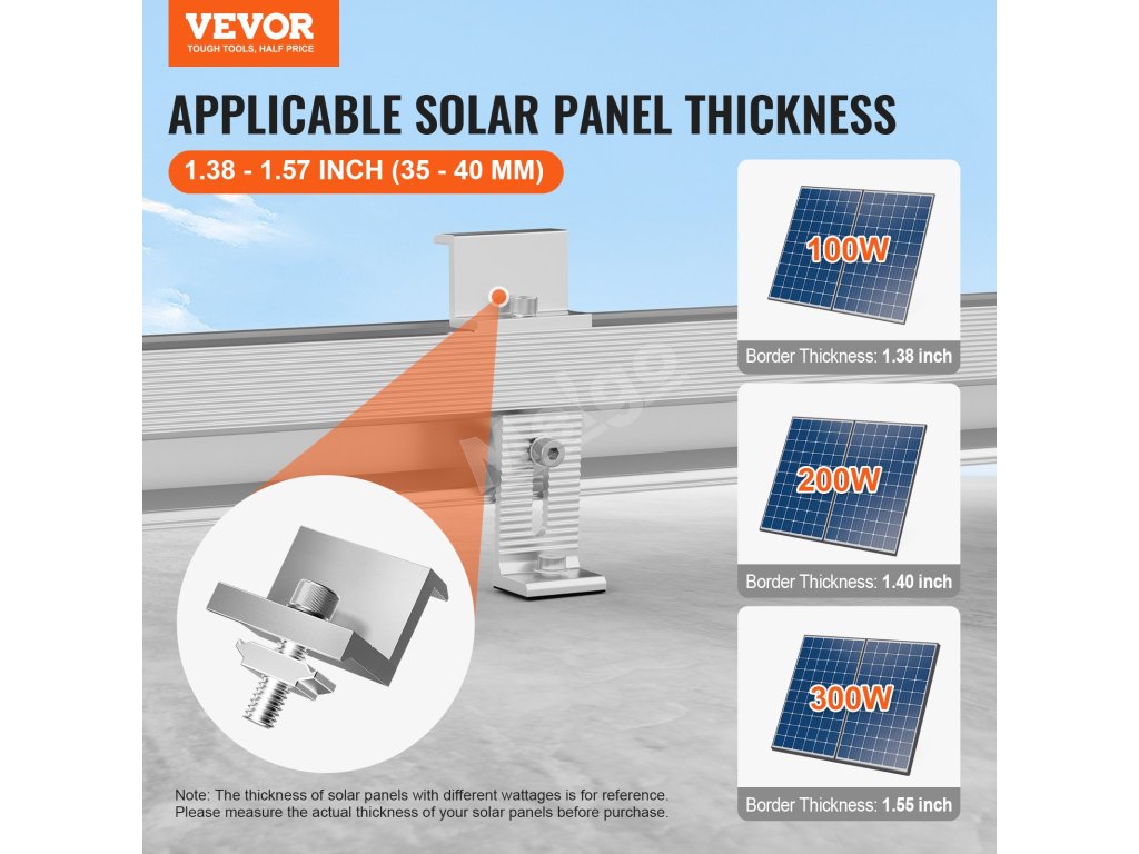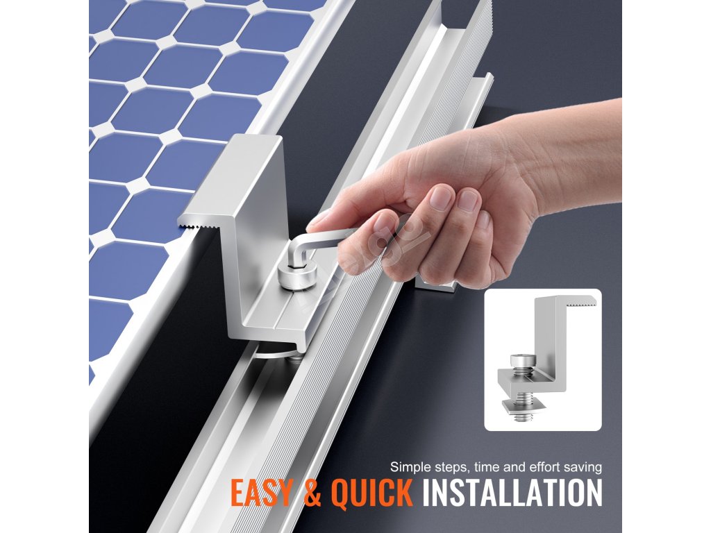 Vyberte si montážnu konzolu VEVOR na solárne panely pre spoľahlivú a stabilnú montáž. nastaviteľná koncová svorka s priemerom 35 až 40 mm sa prispôsobí rôznym hrúbkam solárnych panelov a konštrukcia z eloxovanej hliníkovej zliatiny poskytuje dlhodobú stabilitu, takže je ideálnou voľbou na inštaláciu solárnych panelov.