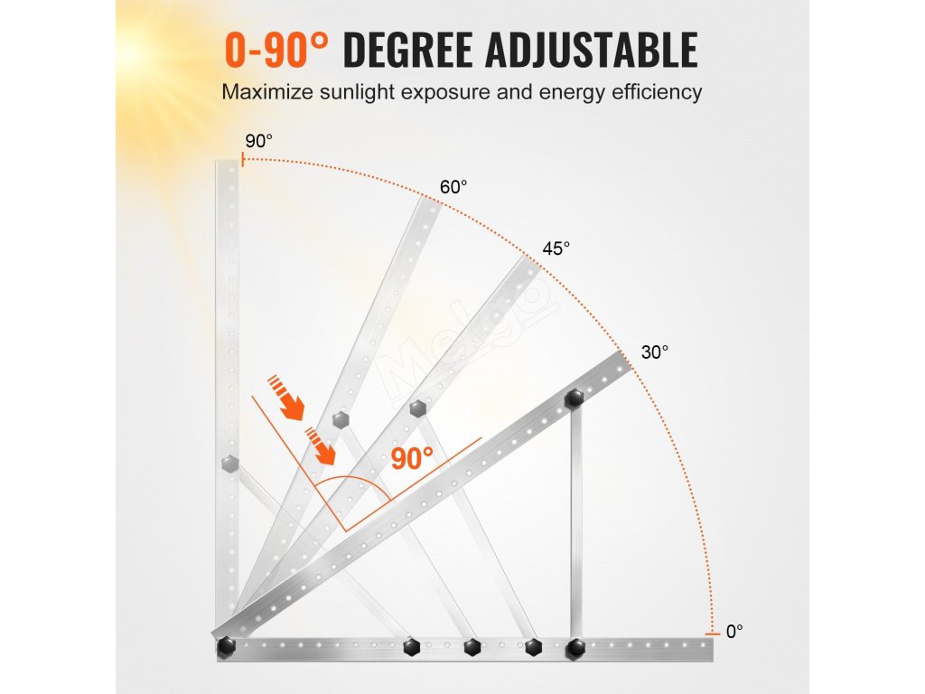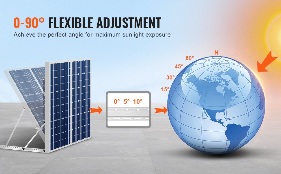 Držiaky solárnych panelov VEVOR sú navrhnuté s flexibilným nastavením 0-90°, čo vám umožňuje ľahko nastaviť uhol tak, aby zachytili maximum slnečného žiarenia a výrazne zvýšili energetickú účinnosť.