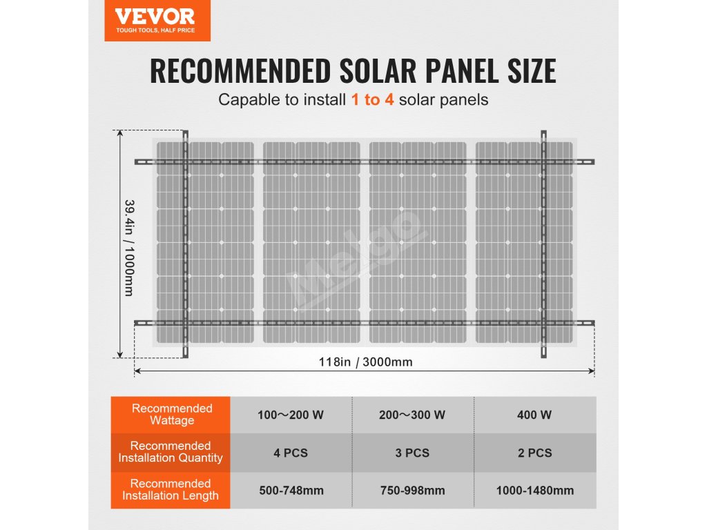 Vyberte si viacdielnu montážnu konzolu VEVOR pre solárne panely, ktorá vám poskytne spoľahlivú a pevnú oporu. nastaviteľný uhol 30°-60° maximalizuje vystavenie slnečnému žiareniu a energetickú účinnosť. nosnosť 330 libier a konštrukcia z uhlíkovej ocele poskytuje trvalú stabilitu, vďaka čomu je ideálnou voľbou na nastavenie solárnych panelov.