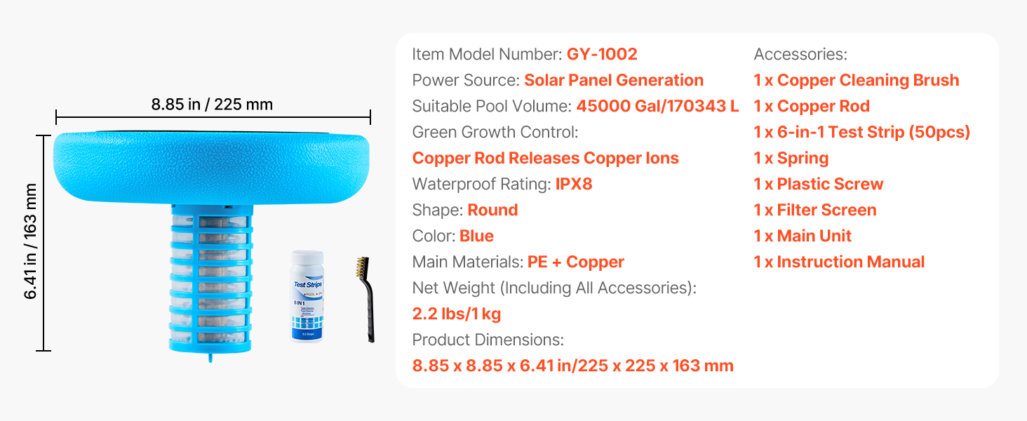 Keď sa hladina iónov medi udržiava na úrovni 0,5–0,9 ppm, môžu účinne kontrolovať rast rastlín a zároveň zachovať čistotu vody. Tento ionizátor medi pre bazény obsahuje 50 profesionálnych testovacích prúžkov na presné monitorovanie. Na čistenie medenej tyče jednoducho použite priloženú kefu, aby ste zabezpečili efektívne uvoľňovanie iónov.