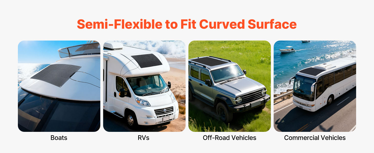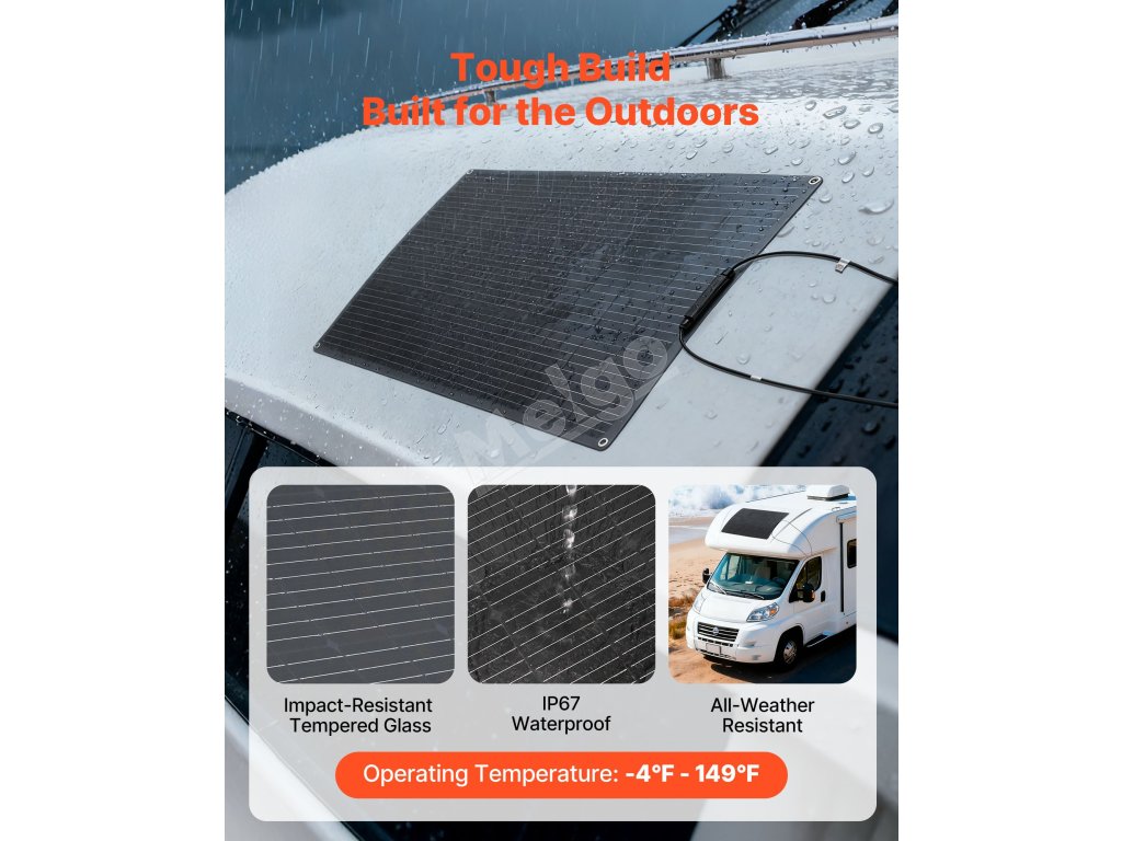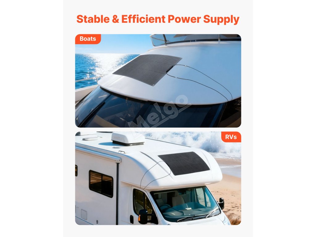 Tento flexibilný solárny panel, ktorý je vylepšený o ohýbateľnú štruktúru, sa prispôsobí zakriveným a nerovným povrchom, ako sú strechy karavanov, lodí, strechy domov a chát. Vďaka tenkej a ľahkej konštrukcii sa jednoducho prenáša, montuje a premiestňuje.
