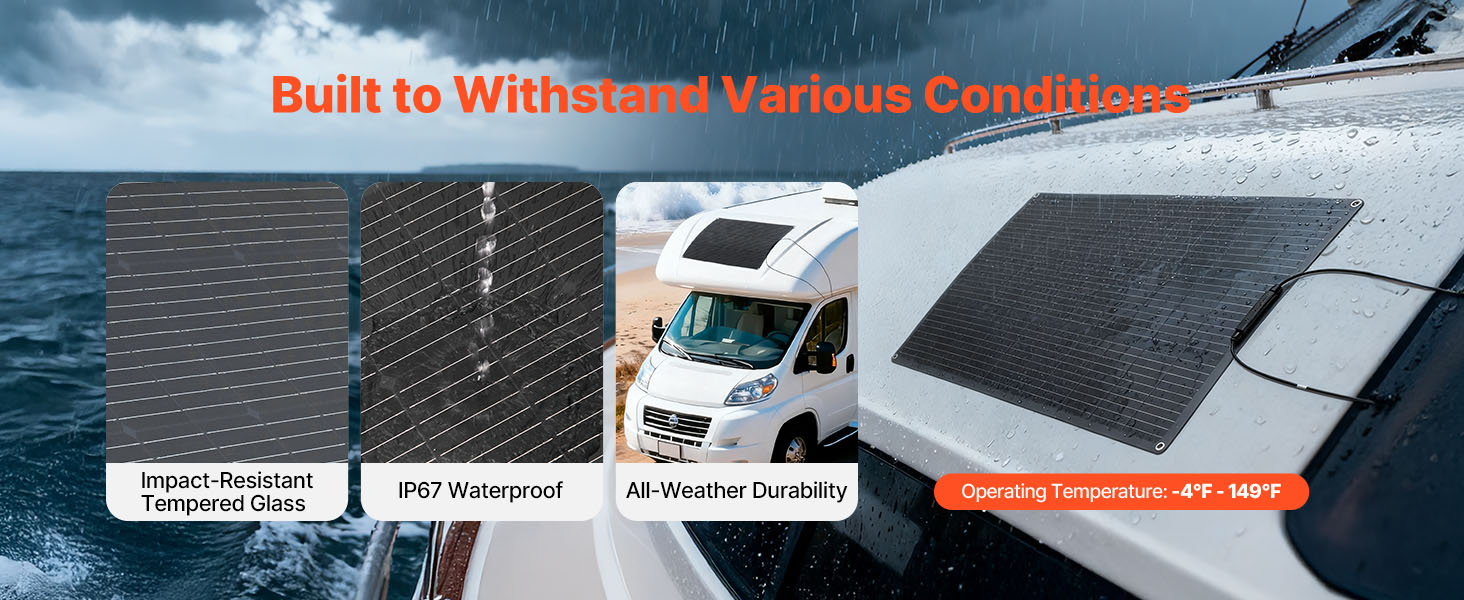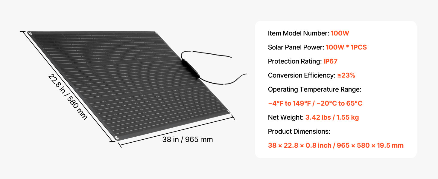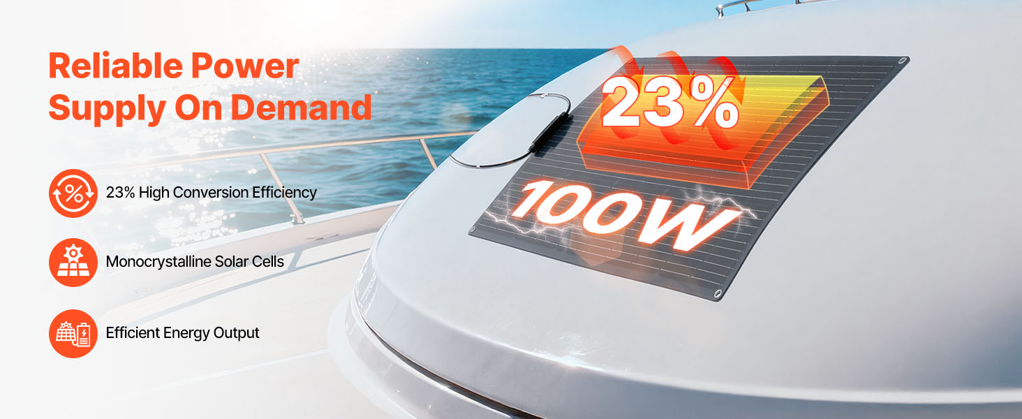 Tento 100W poloohybný monokryštalický solárny panel poskytuje ≥23 % vysokú účinnosť konverzie, čím premieňa viac slnečného svetla na stabilnú energiu. Jeho ľahká, ohybná konštrukcia sa prispôsobí obytným vozidlám, strechám domov, lodiam a iným zakriveným povrchom, čím poskytuje flexibilné riešenie pre aplikácie mimo siete.
