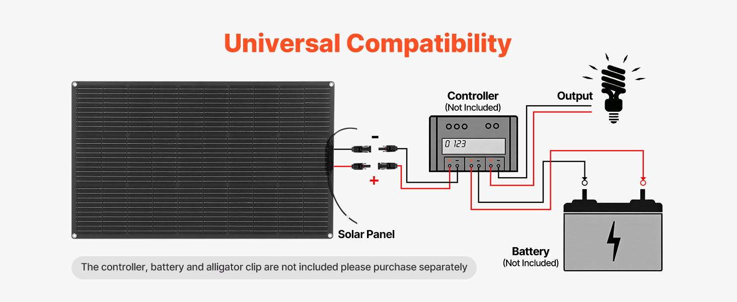 Táto ohybná mono solárna off-grid nabíjačka, vybavená zabudovaným káblom MC4, ponúka bezpečné pripojenie k vášmu regulátoru a batérii pre stabilnú dodávku energie. (Ovládač, batéria a krokosvorky nie sú súčasťou dodávky.)